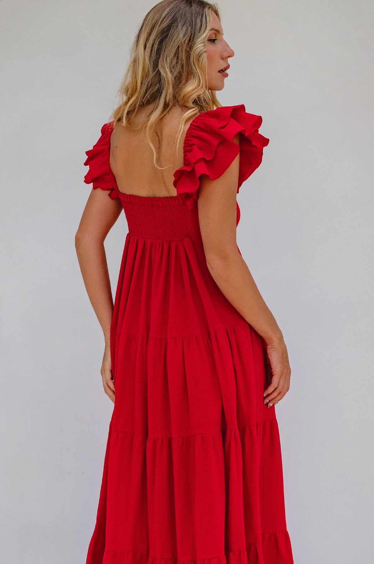 Our Nymph maxi dress has a romantic, tiered silhouette adorned with elasticated ruffled sleeves that enhance the feminine fit. Made from a light and airy crinkle linen into 4 tier maxi style, it's framed with slim self-ties at the neckline. Perfect style to take on your next Summer vacation.