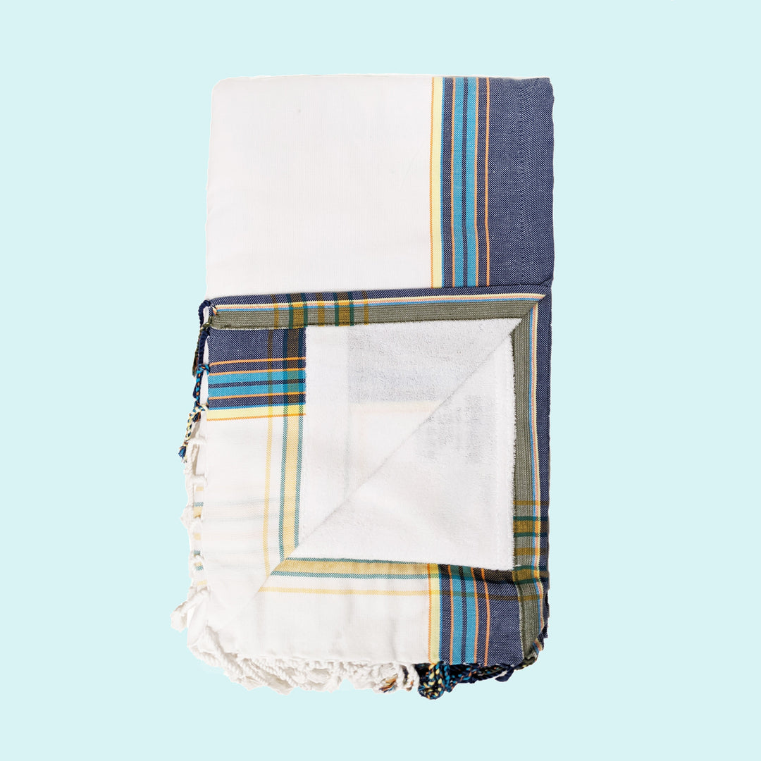 Soak up some sun with the White with Navy Kenyan Beach Towel! Our fair trade Kenyan Beach Towels are ethically crafted in Nairobi, Kenya. We back lightweight and absorbent hand-loomed cotton kikoy cloth with quick-dry microfiber terry for extra absorption. The hidden velcro pocket in the interior is perfect for storing your keys or phone!