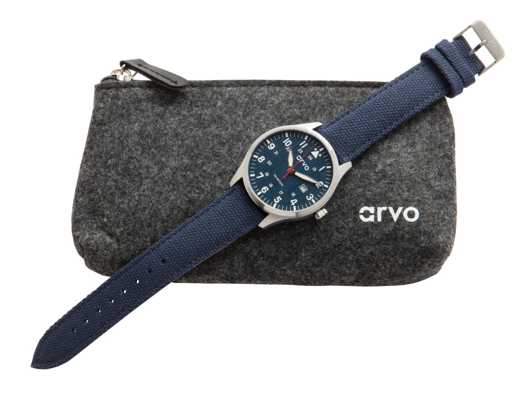 Arvo Rove Field Watches for men come packaged in an Arvo Gray Felt Pouch for you to store your watch or other items of your choice. Reusable, so one less item in a landfill.