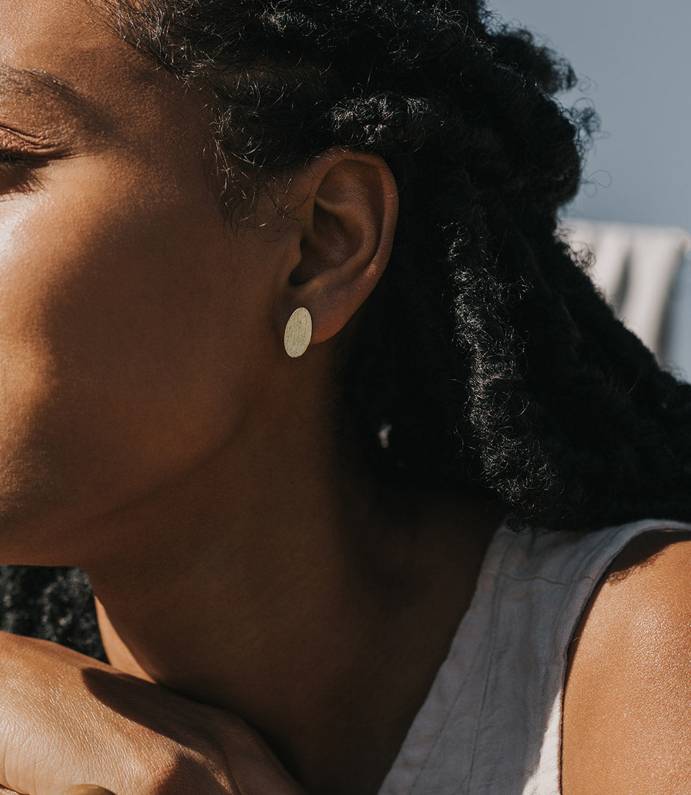 Our refined Diya Collection features handcrafted gold tone on brass elements in clean, minimalist designs, ideal for everyday wear. Traditional jewelry making techniques of Old Delhi are thoughtfully applied in these modern designs. This set of 2 handcrafted stud earrings includes one pair of textured, open circle studs and one pair of smooth, closed oval studs in brass with a gold finish.