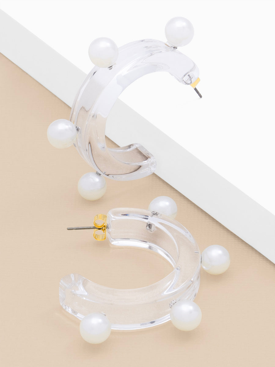 Clear lucite open hoop earring with pearl embellishments.