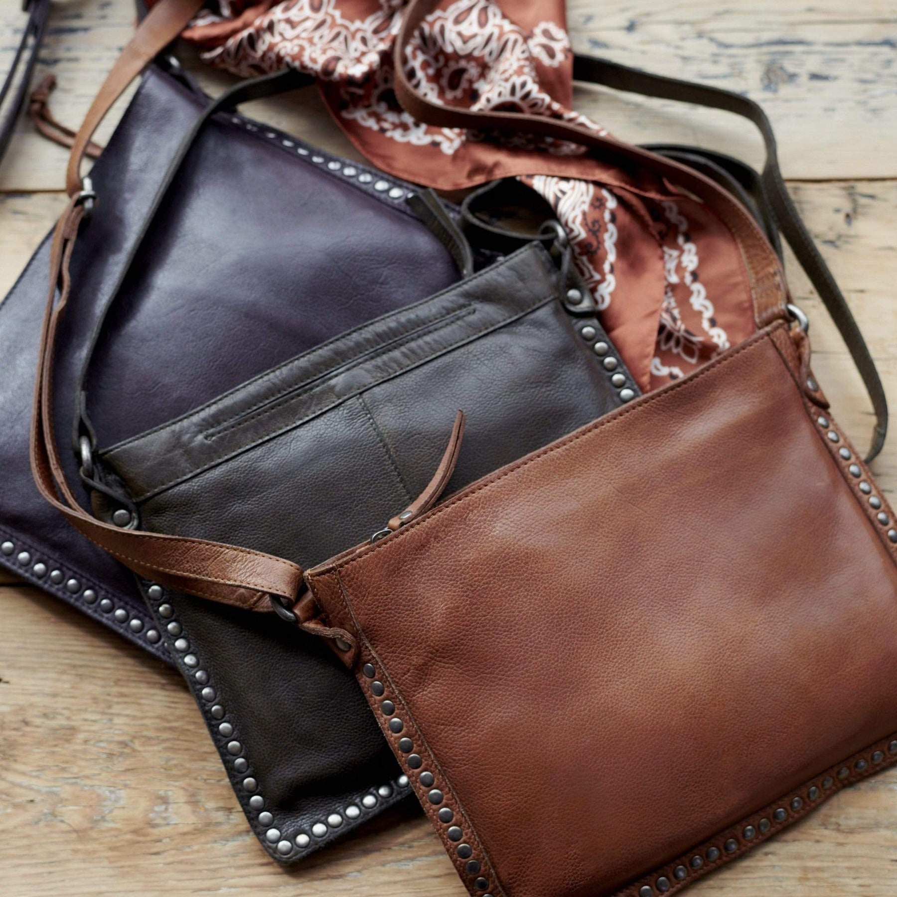 Meet the soft and buttery Gabriel Leather Studded Crossbody, adorned with 3-sided studs on the front and back that make it irresistible. Handcrafted from 100% full-grain leather by artisans in South America and India, this stylish bag features an adjustable crossbody strap, top zip entry, and our signature hidden exterior cell phone pocket. Get ready to fall in love with Gabriel.