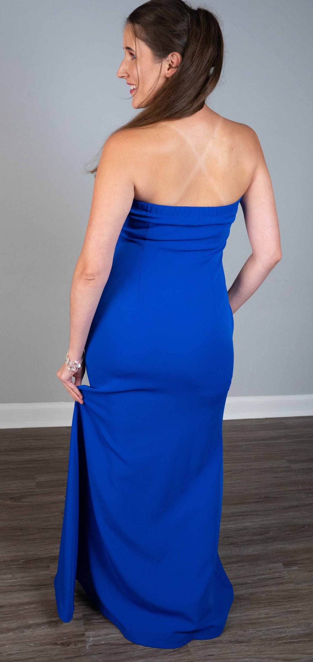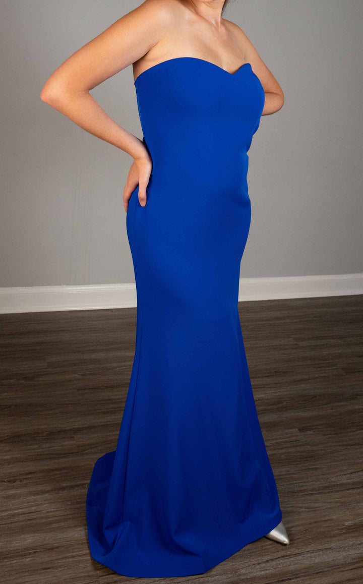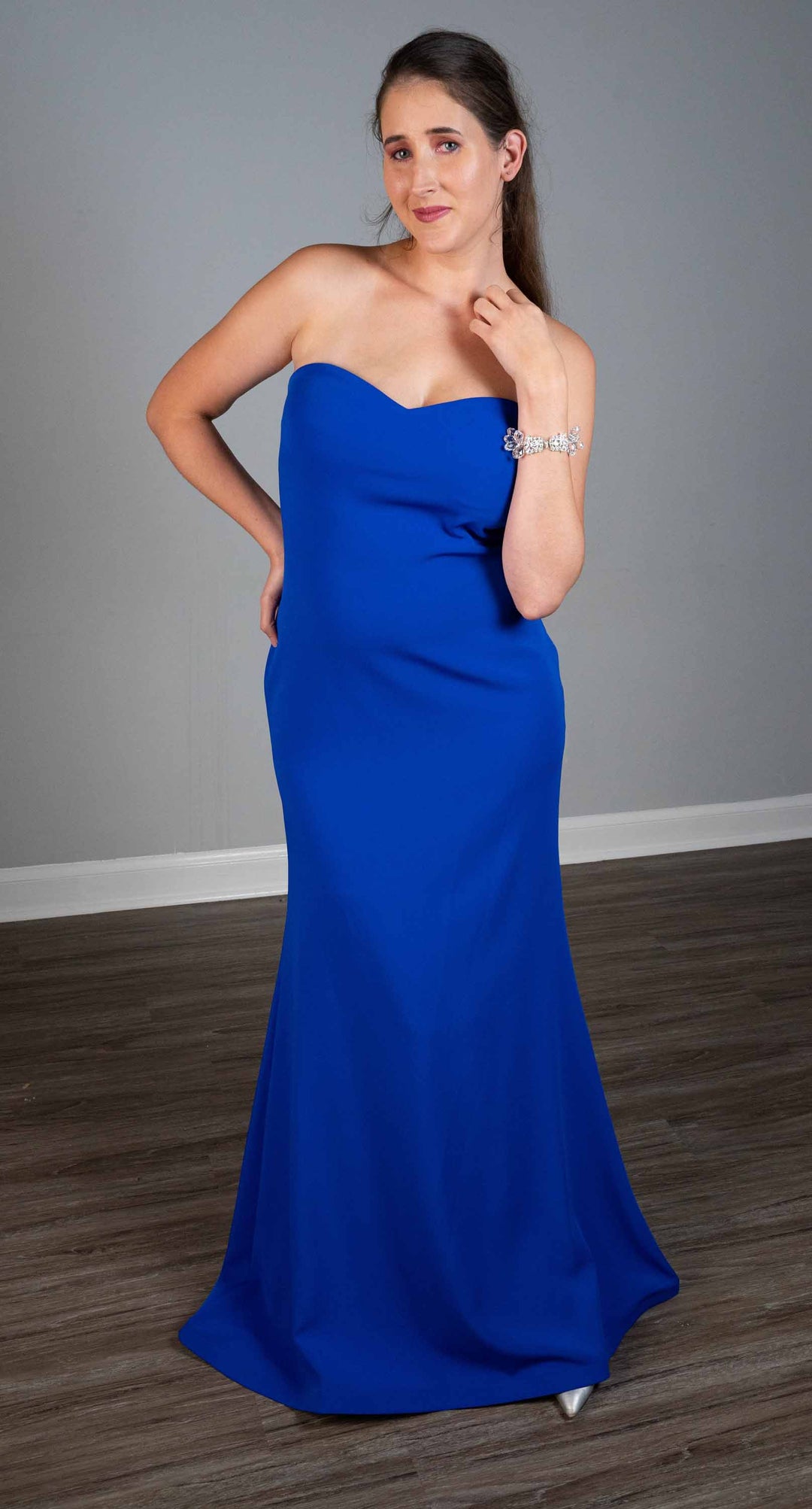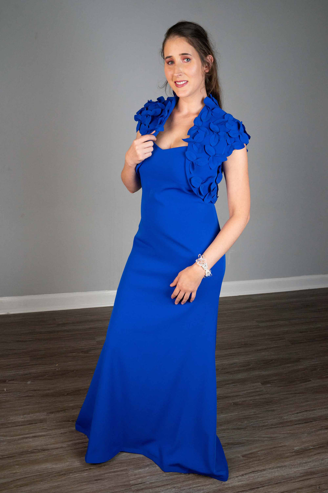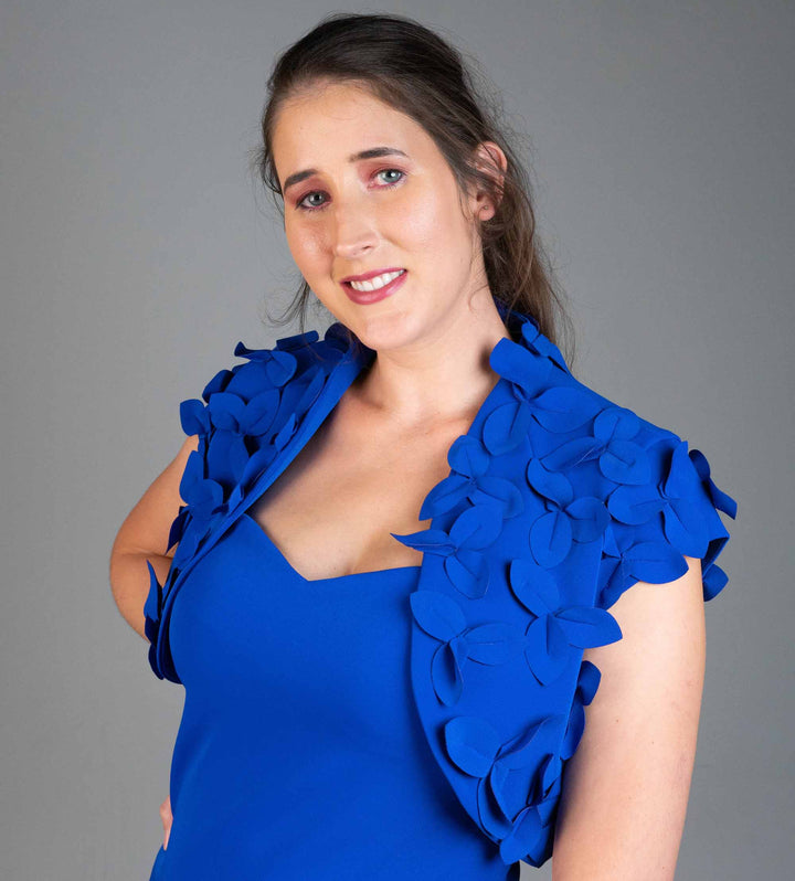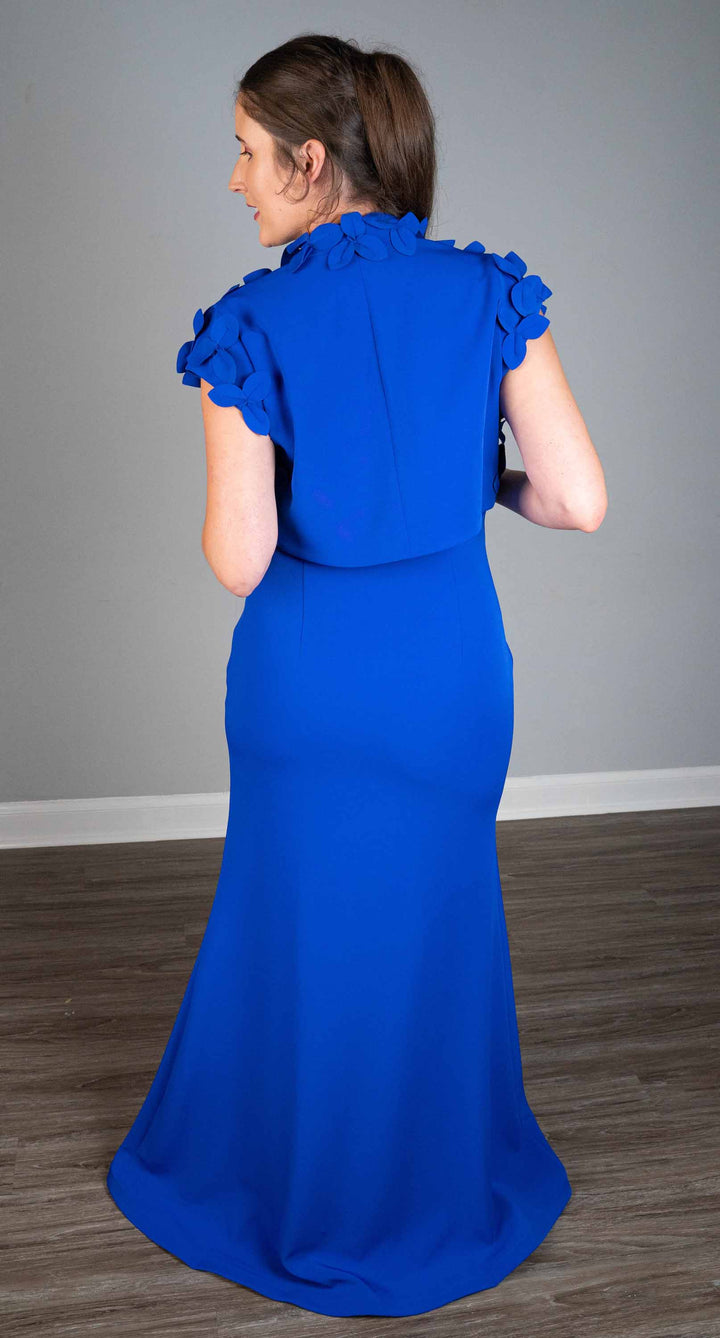Vibrant cobalt blue strapless sheath gown with floral cutout bolero.