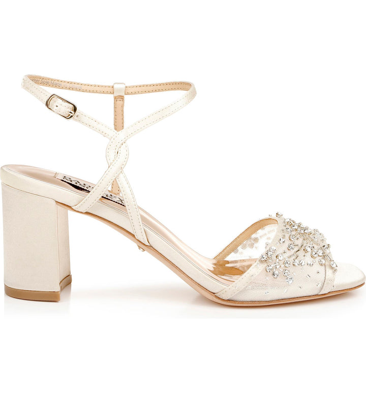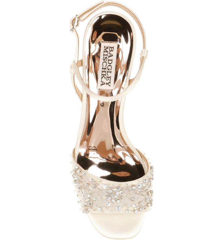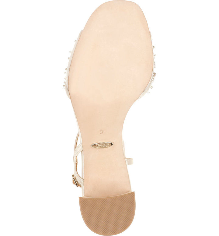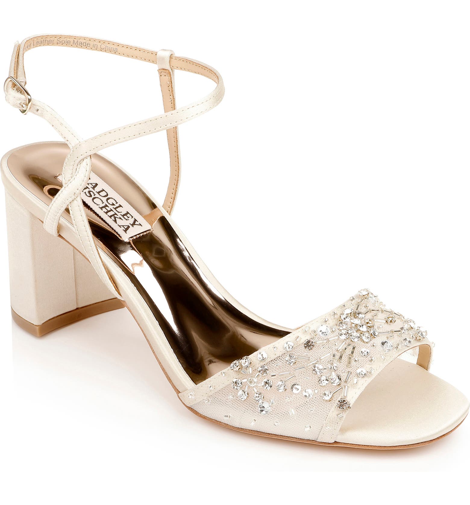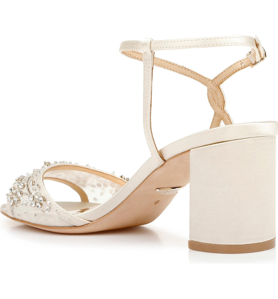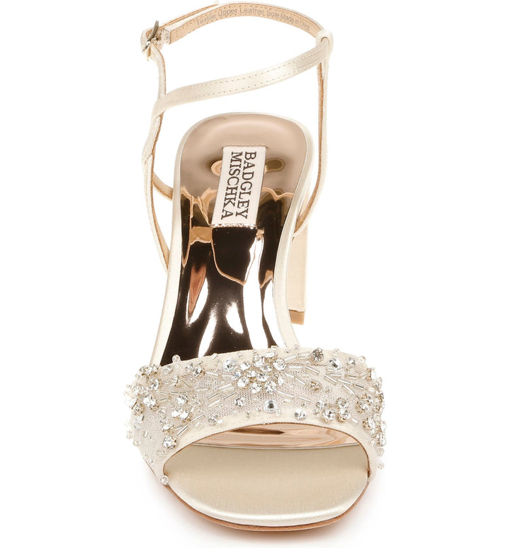 A breathable vamp strap is embellished with glittering beads and crystals on this elegant sandal set on a cushioned footbed and walkable block heel.