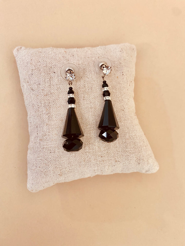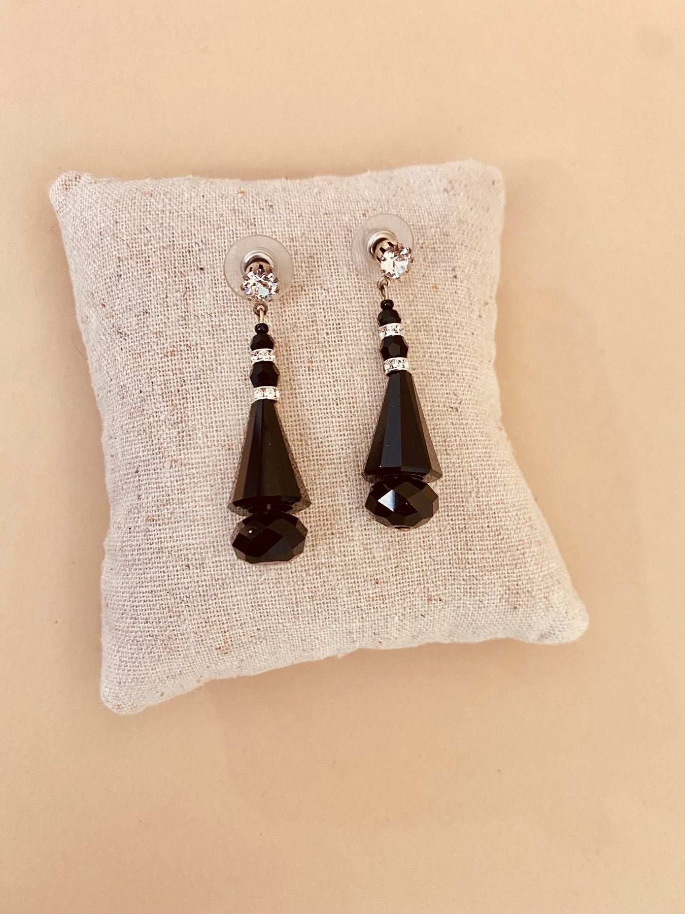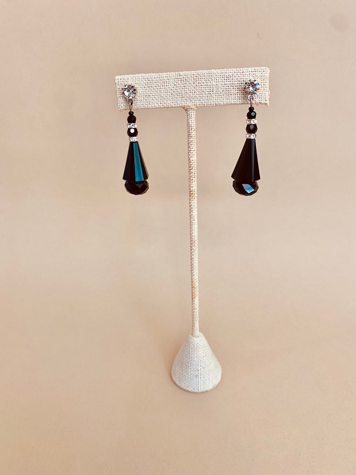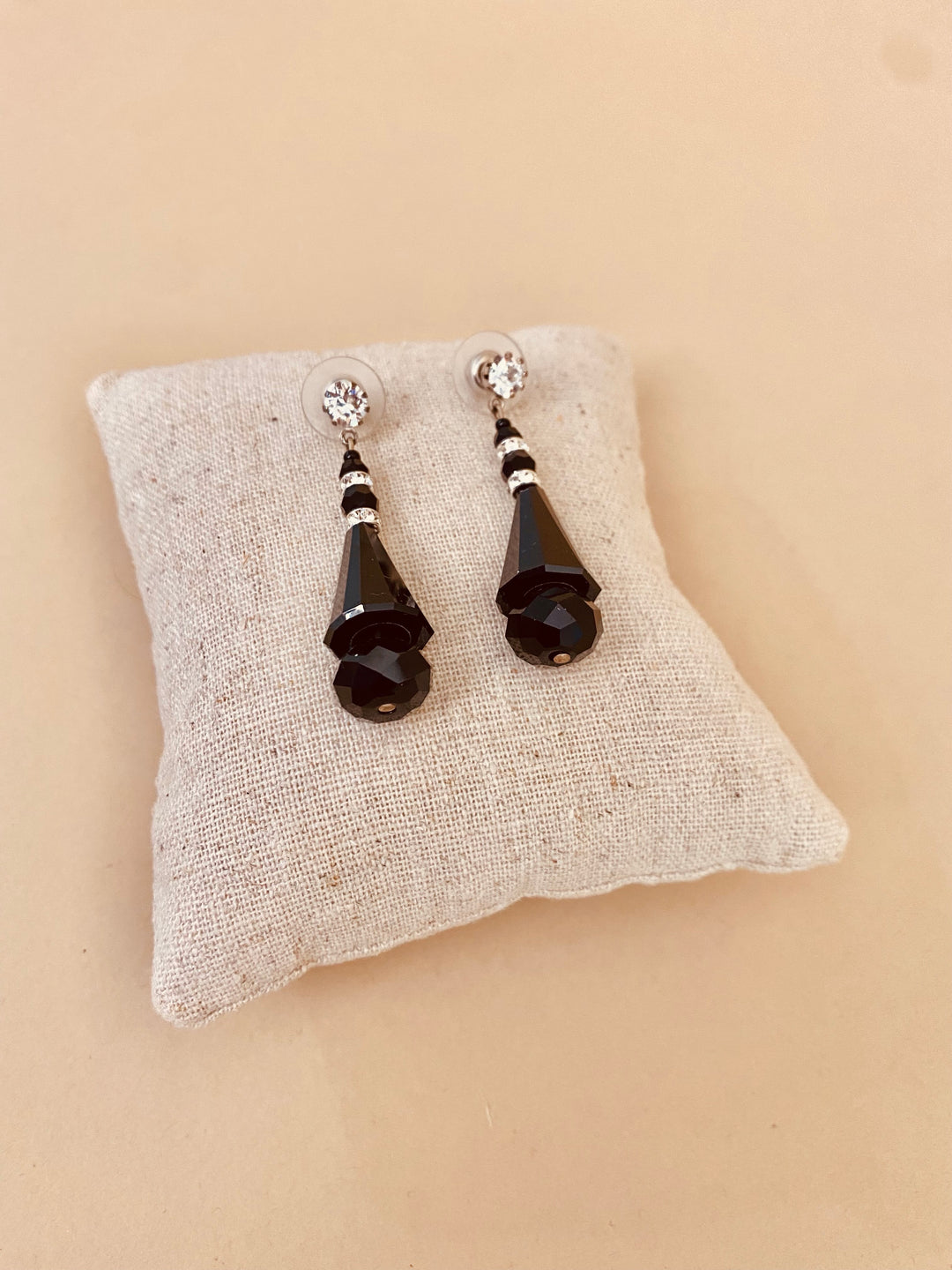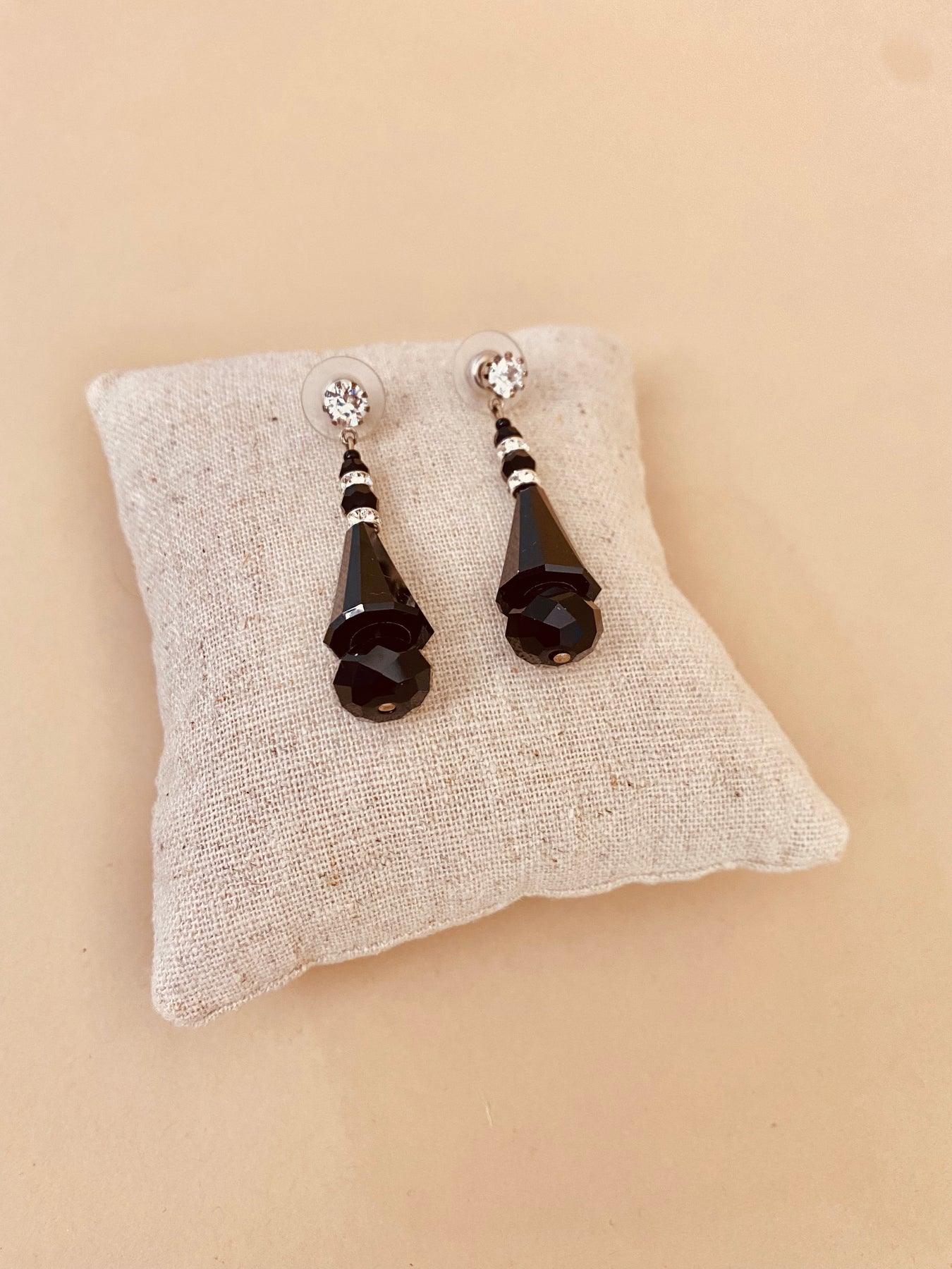 Cubic Zirconia posts are affixed to round clear and black crystals and a retro cone-shaped crystal design.