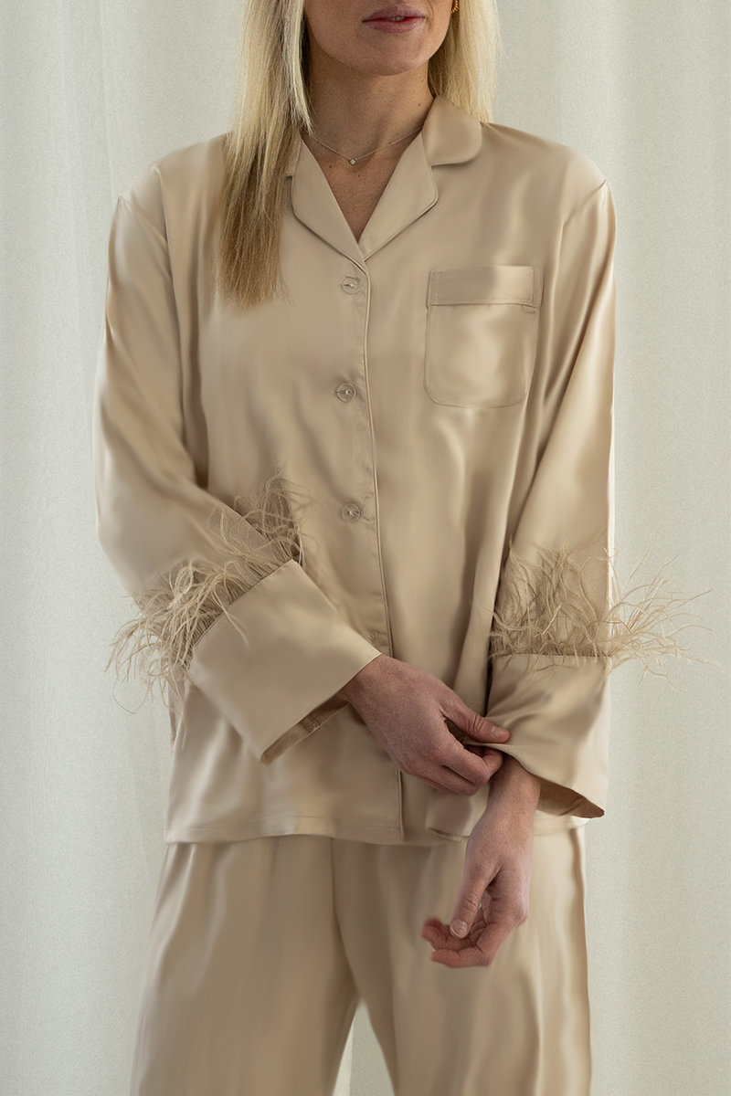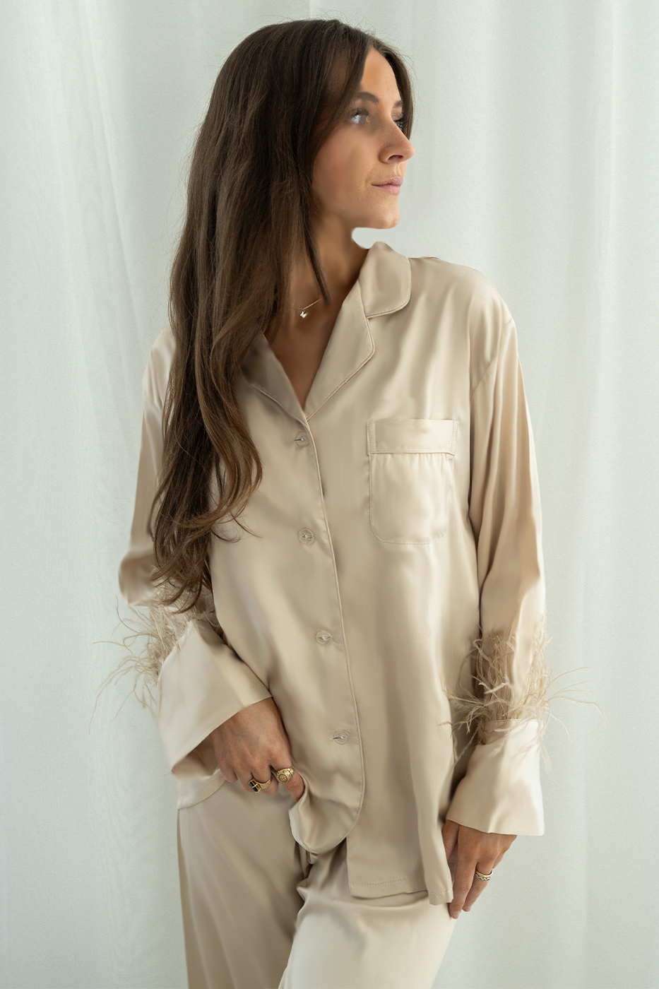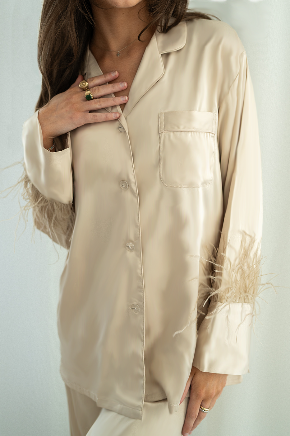 Discover the art of luxury with our Champagne Feathers Satin Pants Set. Beyond its beautiful appeal, it's a testament to our superior quality and comfort. Crafted from an exquisite satin fabric that blends the subtle stretch of spandex, every inch promises an added touch of flexibility and softness.