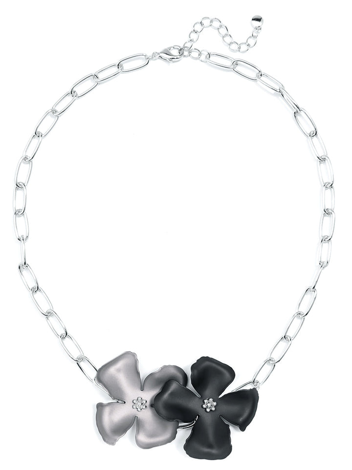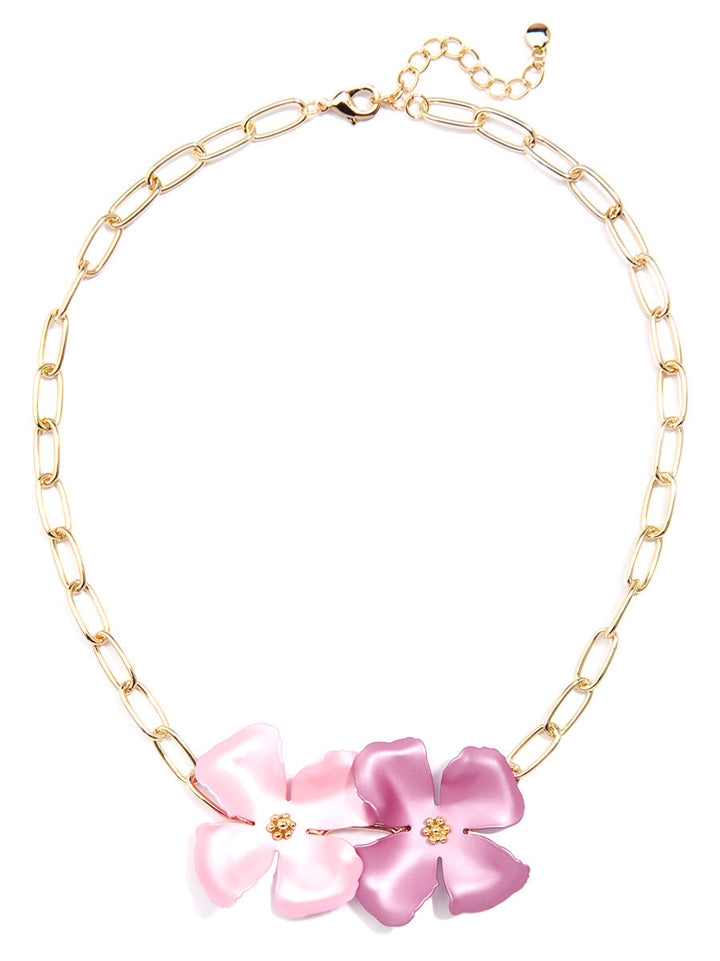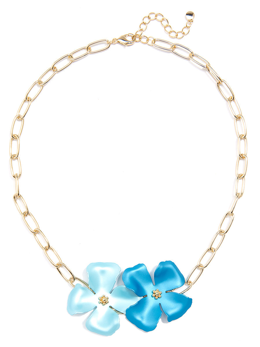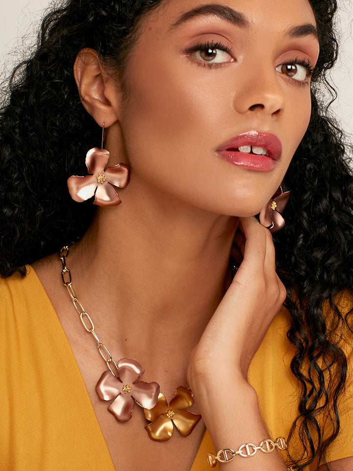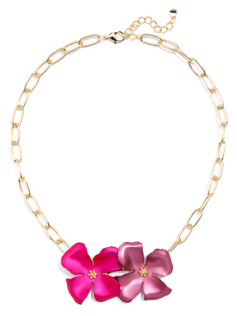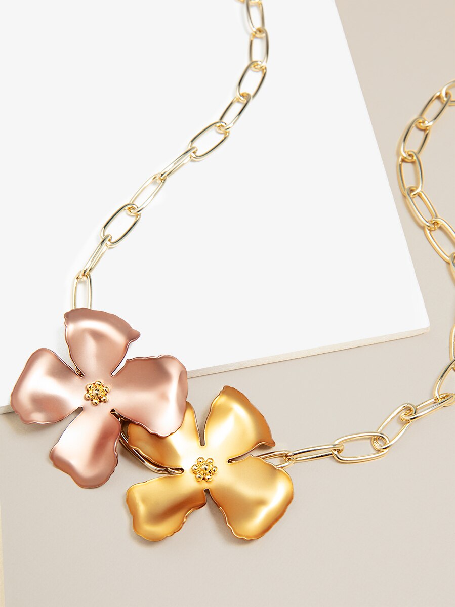 Elevate your ensemble with a pop of metallic color. This style is composed of 18k gold-plated links with two hand-painted, metallic flowers.