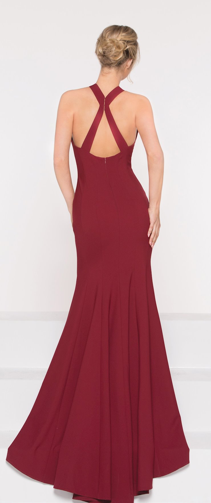 Make an entrance in this shapely halter neckline, criss-cross back mermaid style gown.