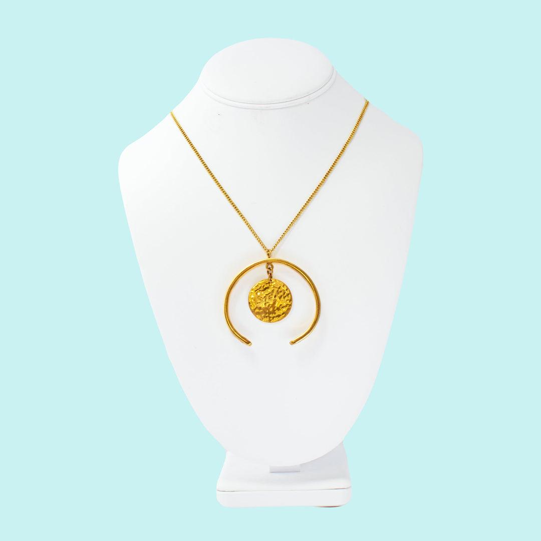 The Crescent Pendant Necklace features a circular pendant with a small dangle on a simple brass chain. Wear it with your favorite sundress a bohemian look that is all your own!
