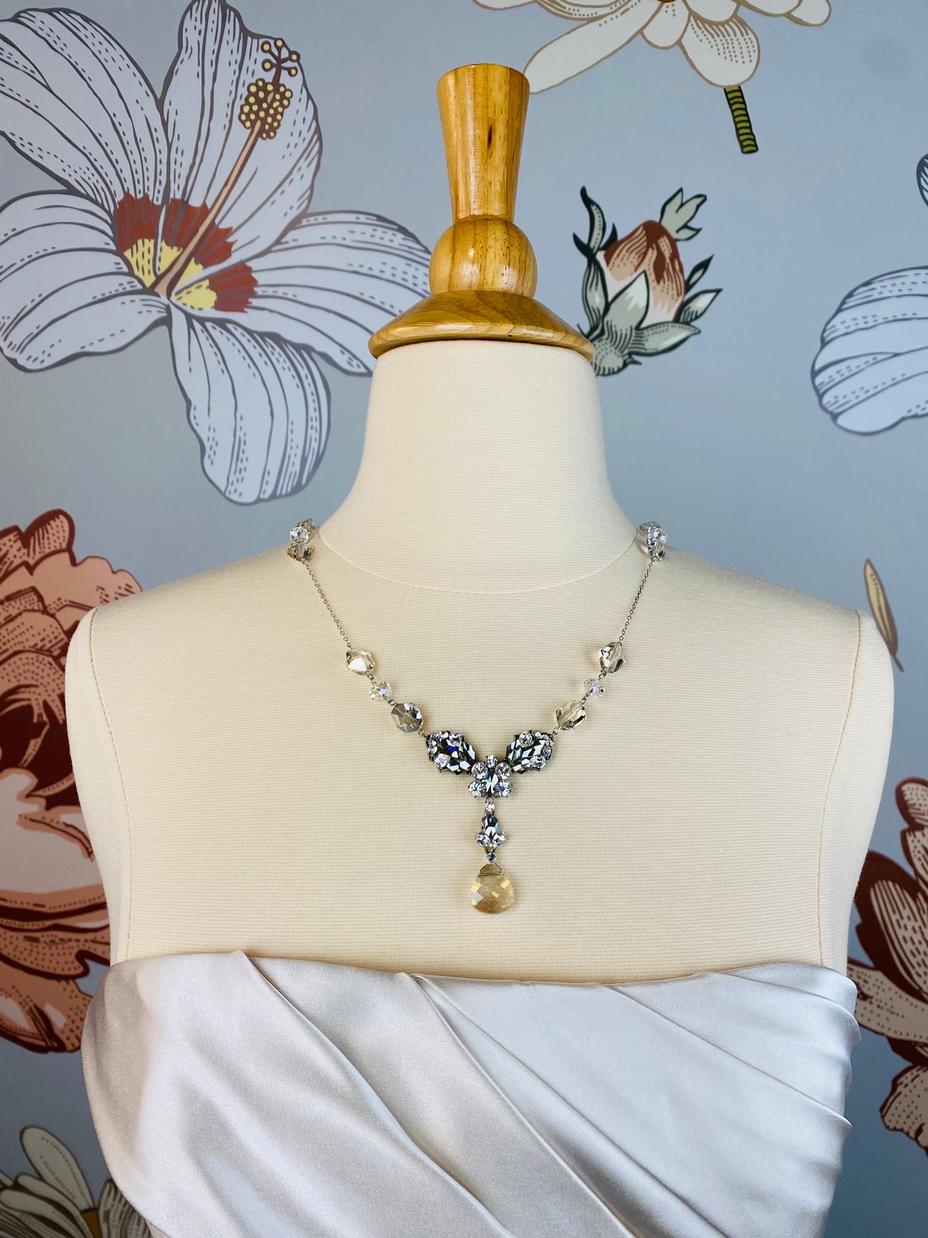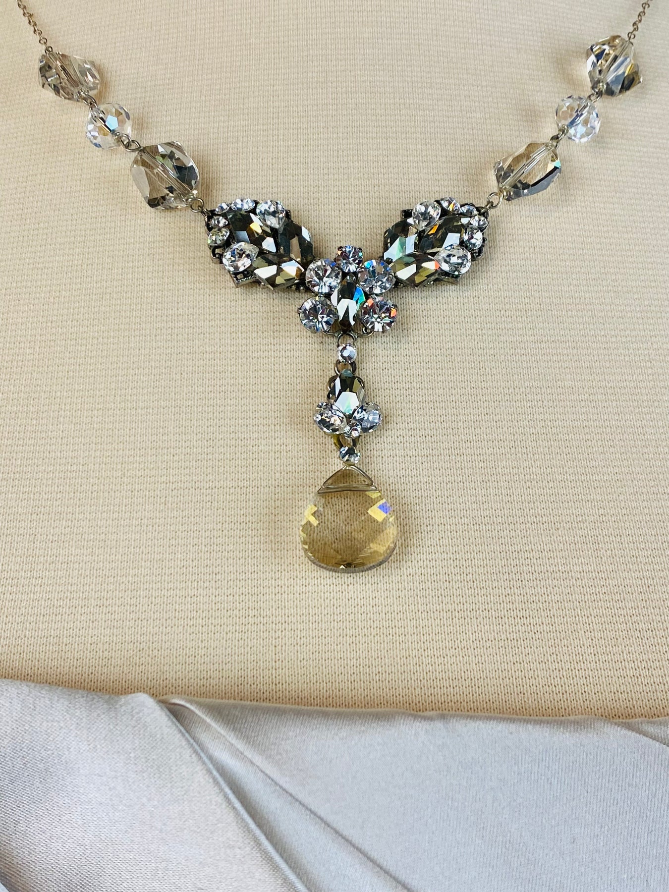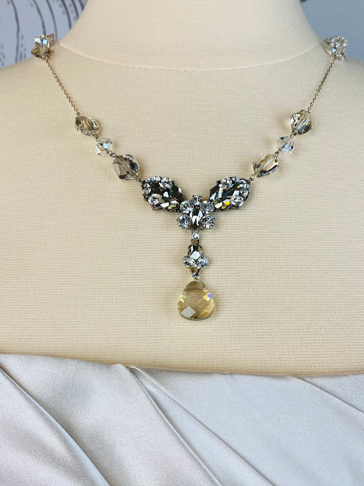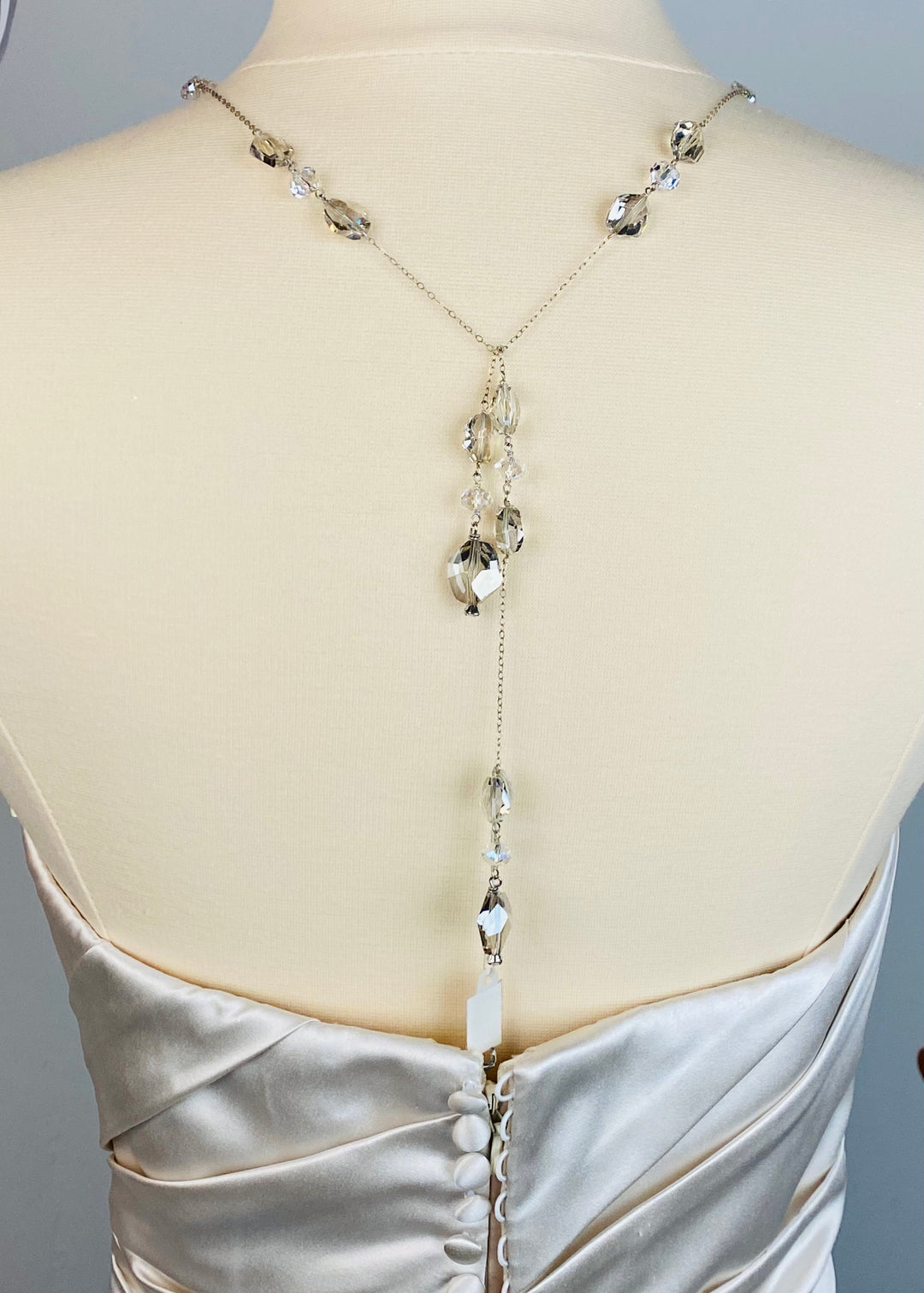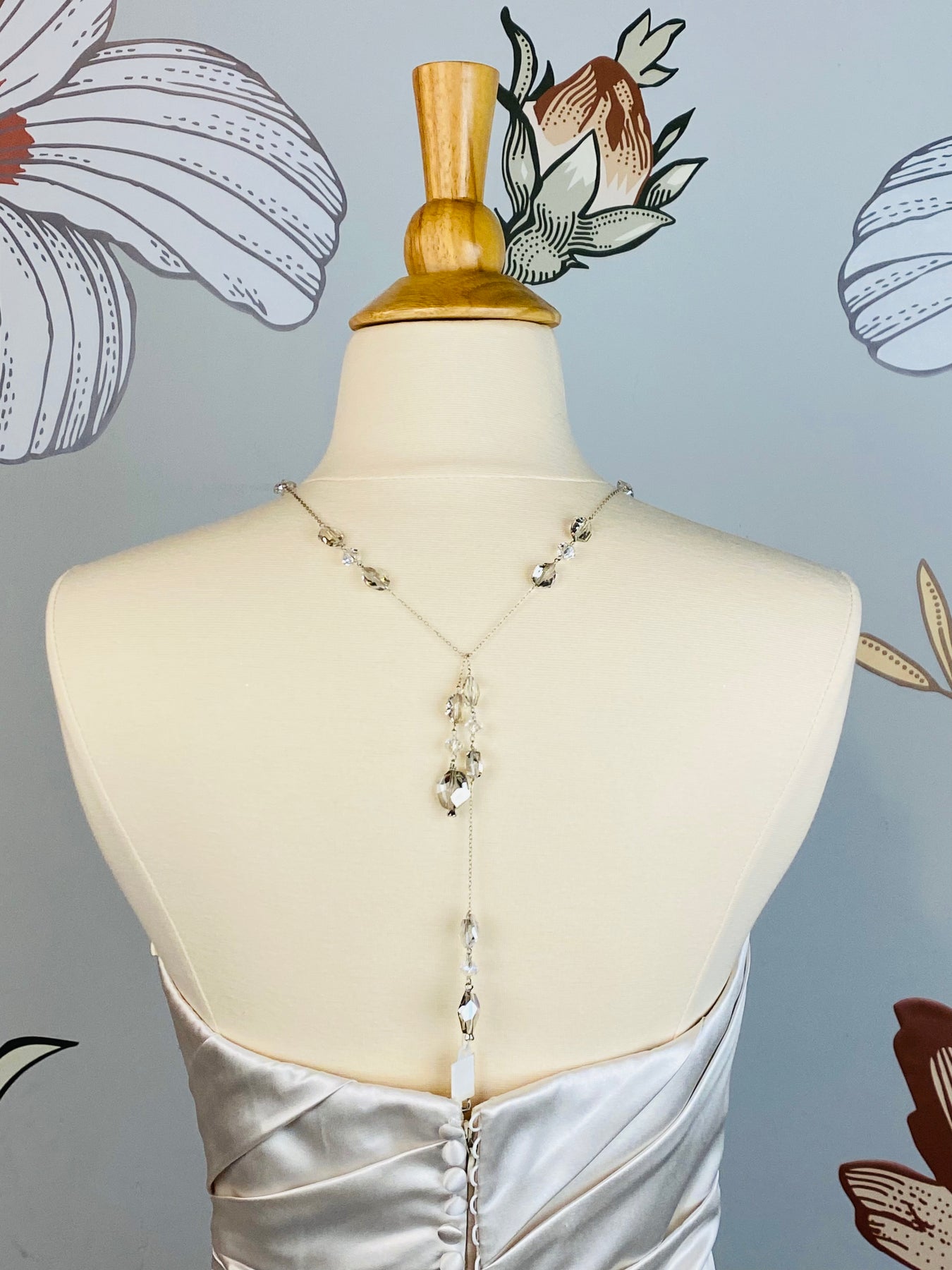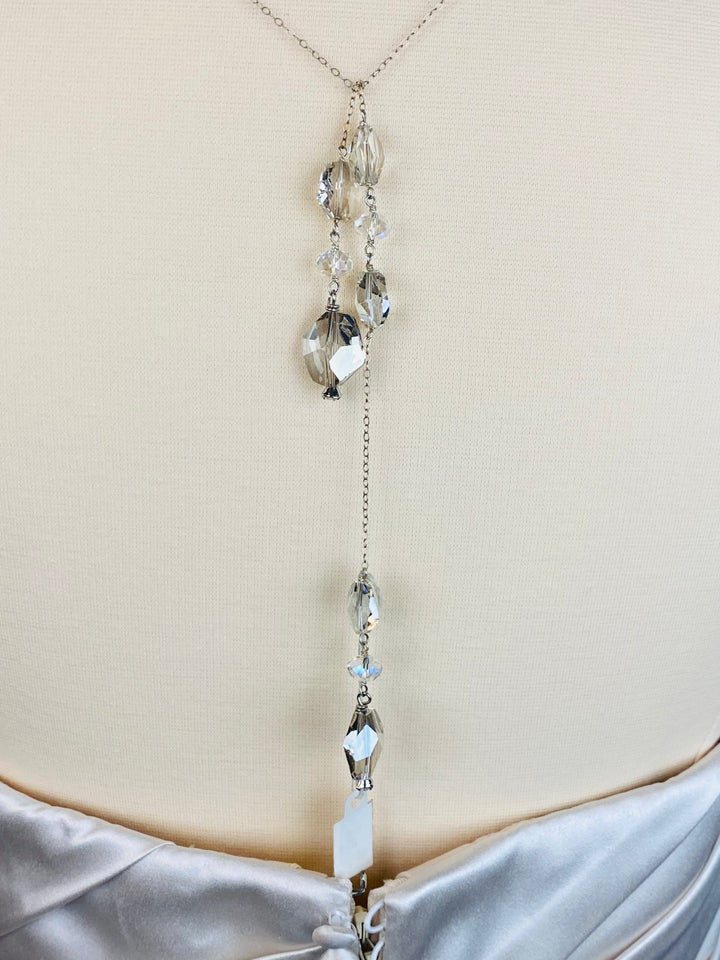 This statement lariat shines at every angle and beautifully cascades down the back.