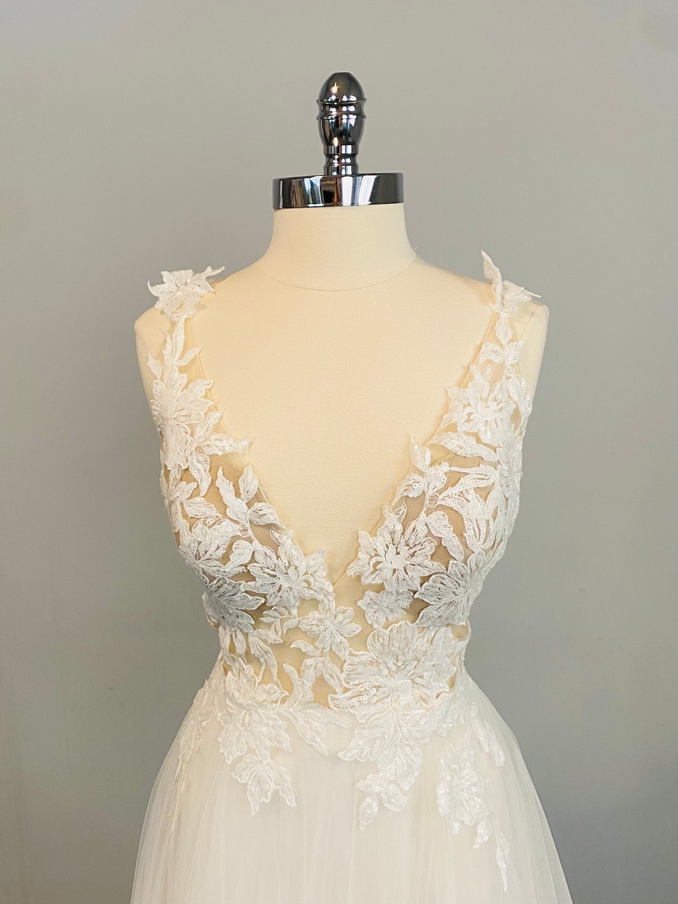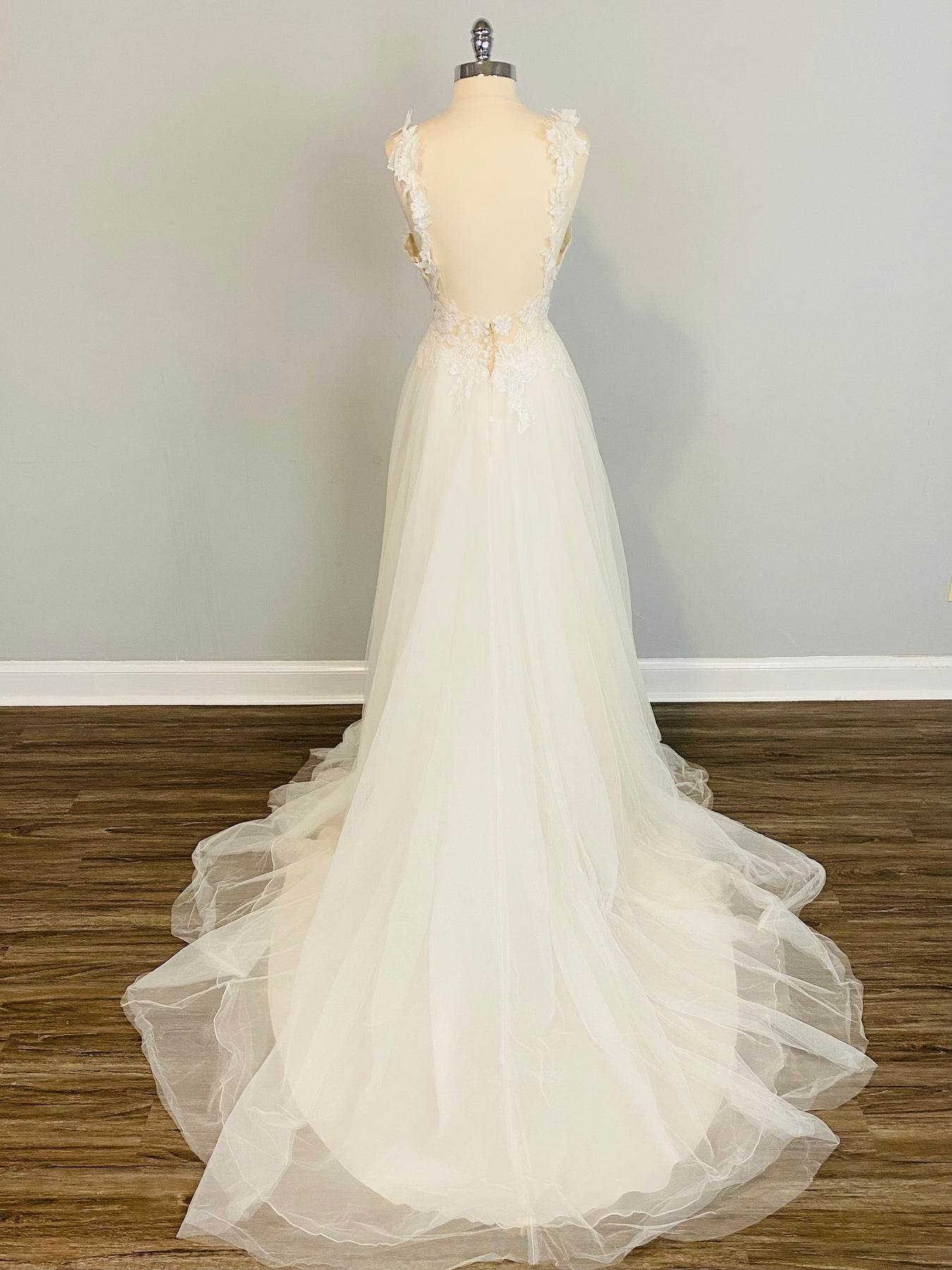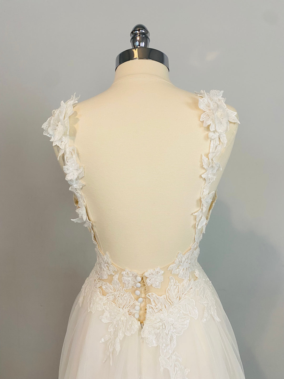 Sweet and feminine with all the right floral details. Large floral lace is showcased at the bodice as it leads to a jaw-dropping, beautiful low back. Soft layers of tulle at the skirt add to its whimsical enchantment. The lovely look is complete with lacy floral straps and covered buttons. Color is Ivory/Beige. The loops to the buttons are loose and need to be tightened by a seamstress.
