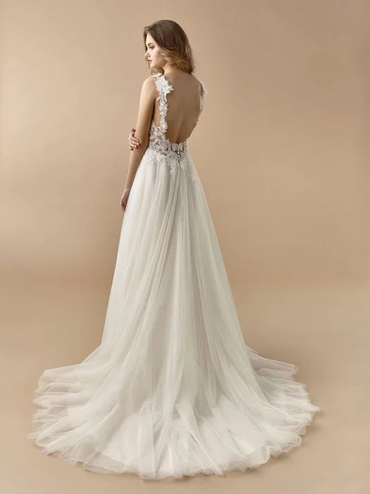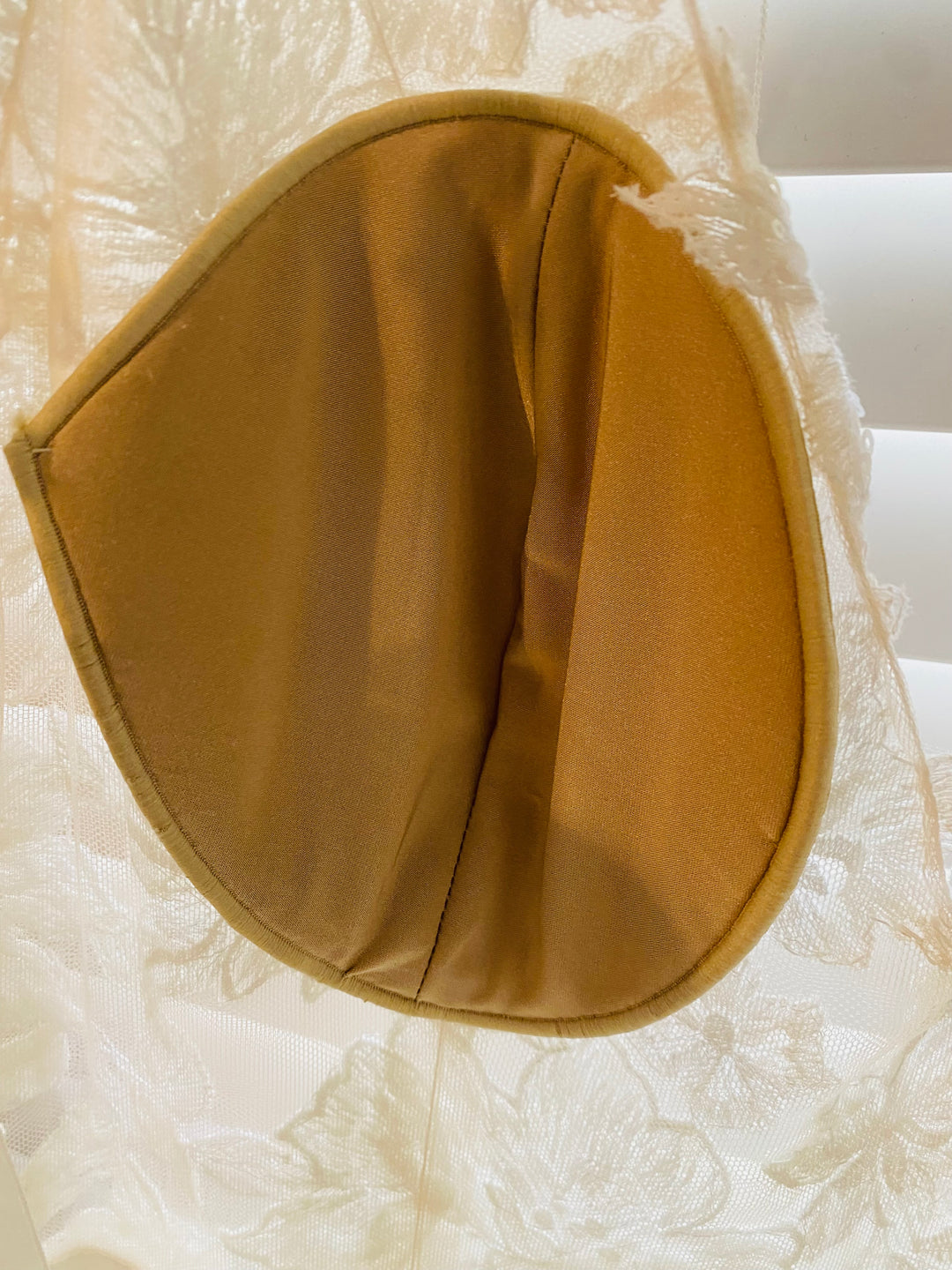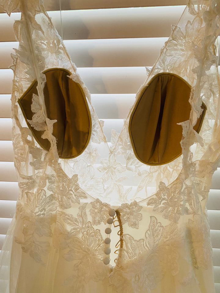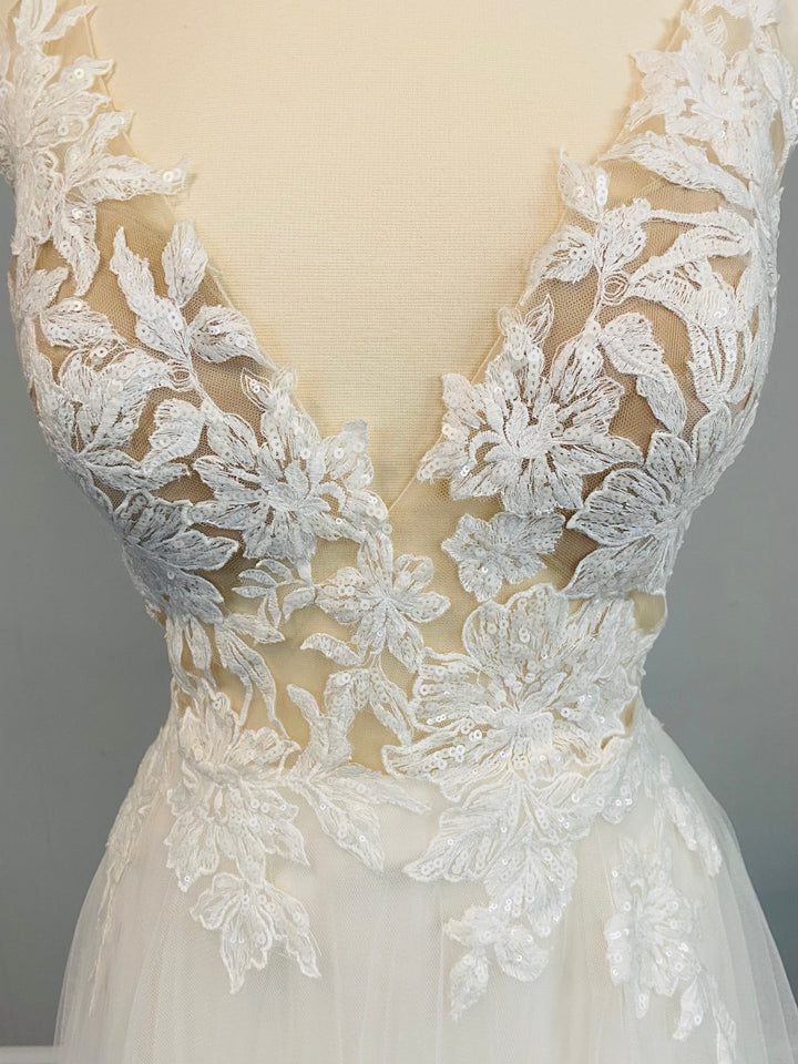 Sweet and feminine with all the right floral details. Large floral lace is showcased at the bodice as it leads to a jaw-dropping, beautiful low back. Soft layers of tulle at the skirt add to its whimsical enchantment. The lovely look is complete with lacy floral straps and covered buttons. Color is Ivory/Beige. The loops to the buttons are loose and need to be tightened by a seamstress.