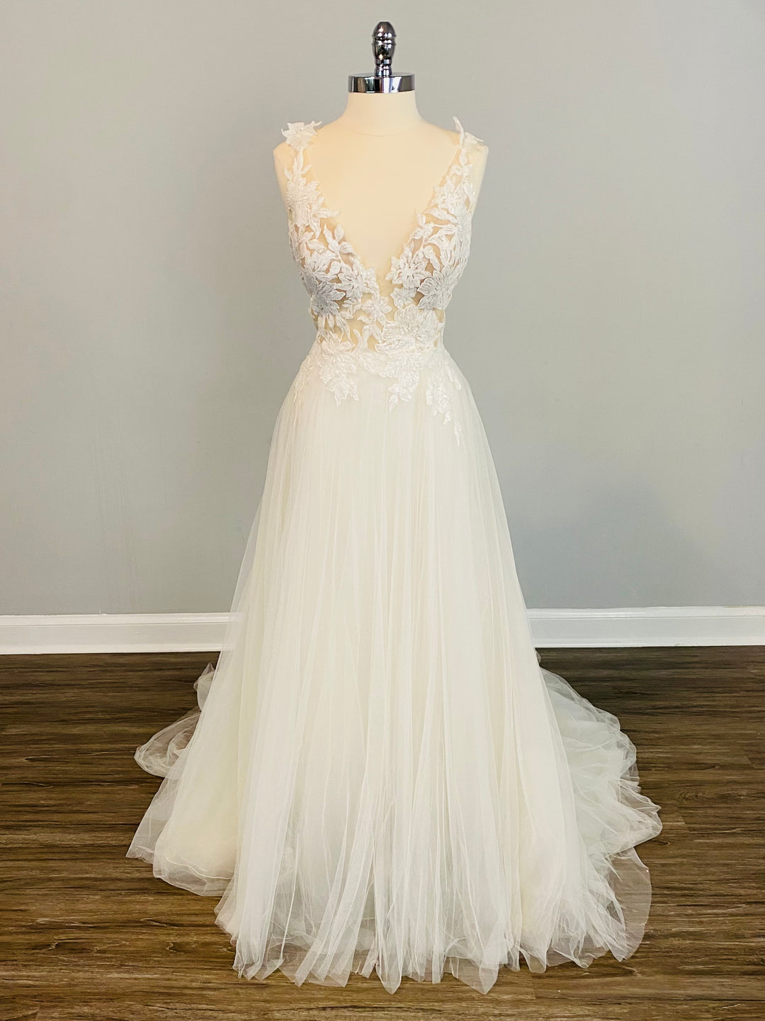 Sale wedding dresses, bridal party dresses and bridal accessories come to us directly from small independent retailers and brands and are mostly discontinued samples.  This merchandise has never been previously purchased or altered, and while most of these goods are in immaculate condition normal wear and tear can occur during previous try on.  Any defects outside of normal wear are disclosed in each listing.