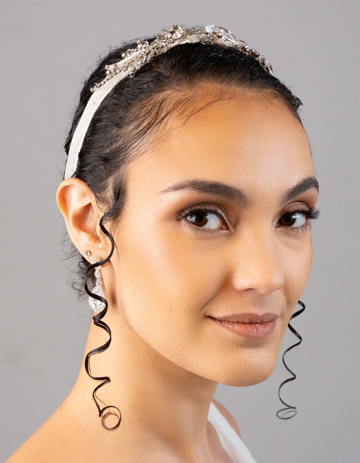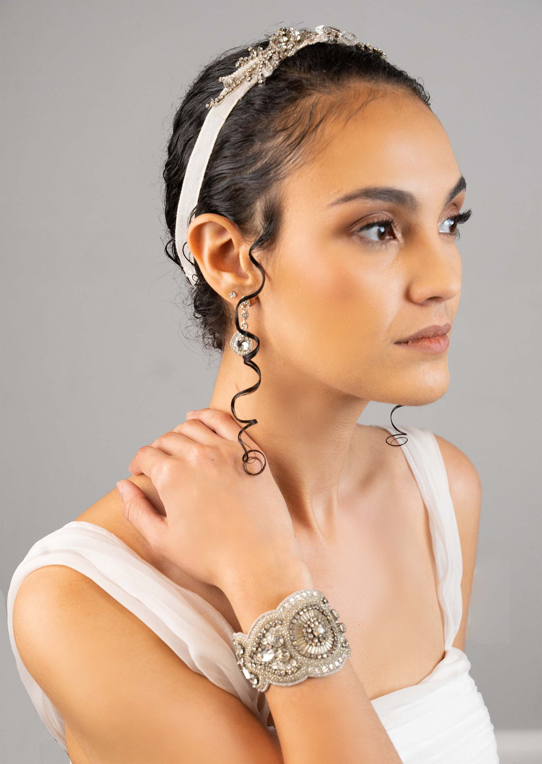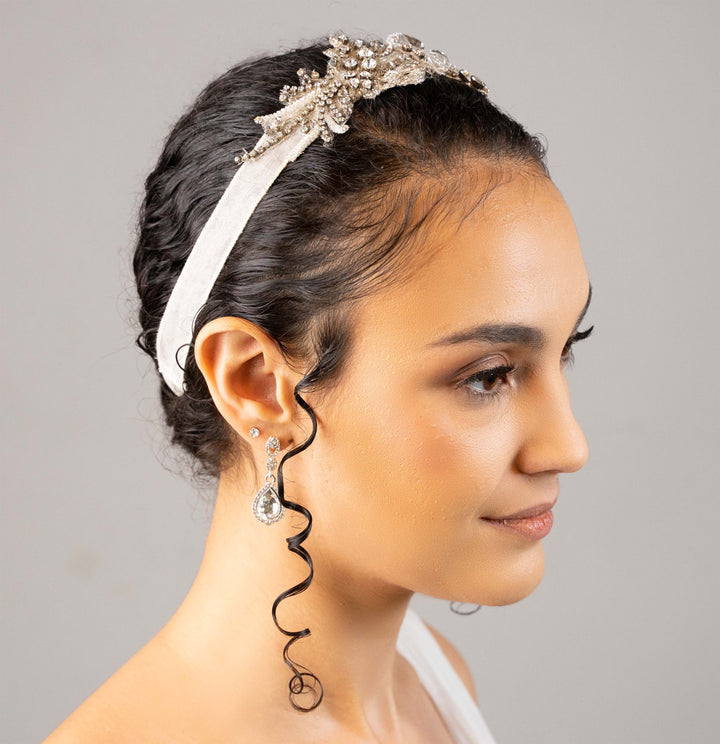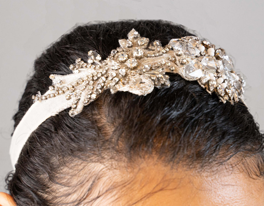 A vintage inspired organza headband with rhinestones and crystals