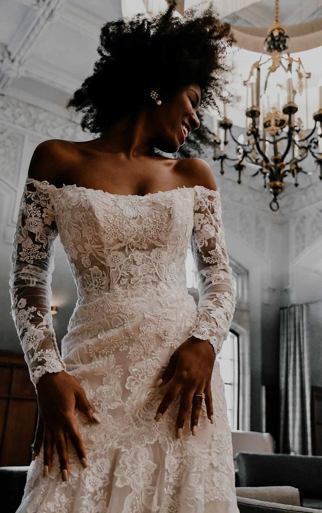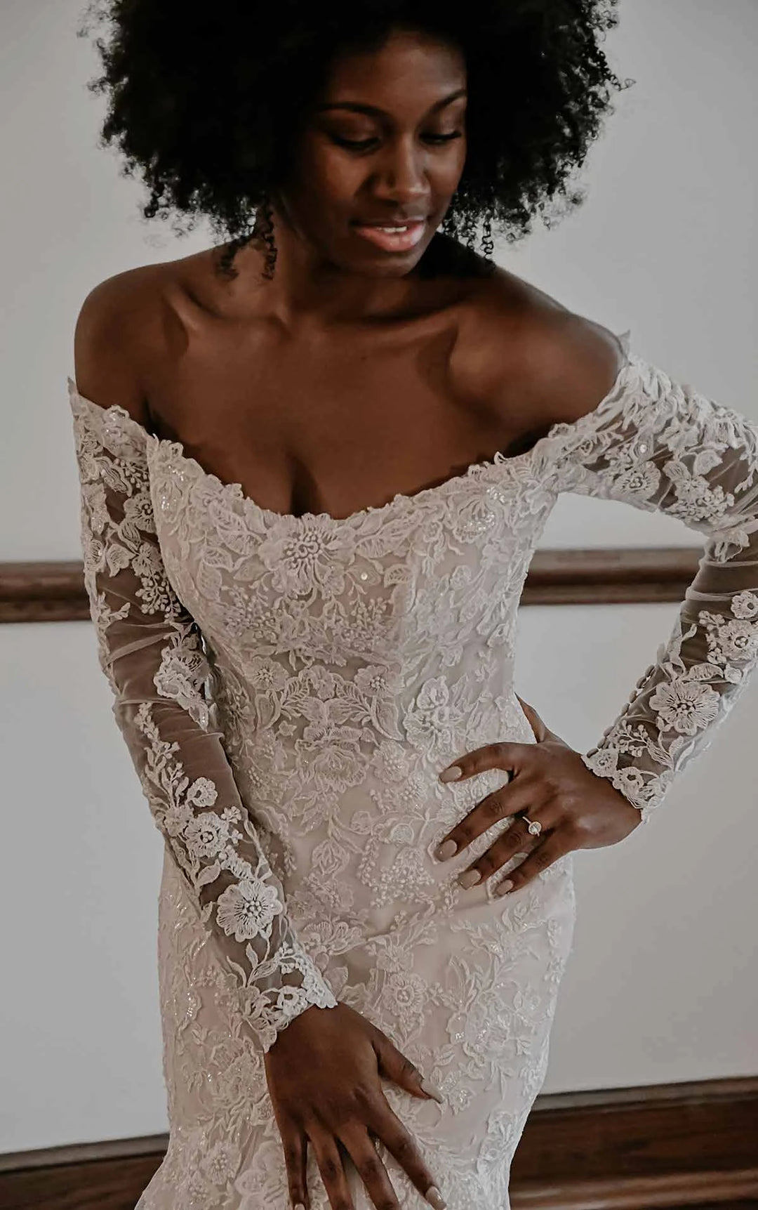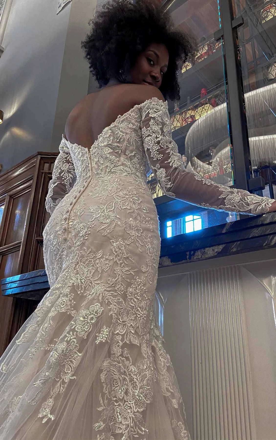 Indulge in the exquisite and alluring Style D3255 from Essense of Australia. This beautiful gown boasts a delicate off-the-shoulder neckline, gracefully highlighting the décolletage and cascading into a gorgeous floral motif over the bodice and sheer long sleeves. The intricate lace patterns add depth and structure to the silhouette, effortlessly flattering and supporting the figure. Shimmering details add a touch of softness to the otherwise dramatic train, featuring layers of tulle, lace, and Regency organza for a frothy and elegant finish. Elevate your bridal look with this stunning creation.