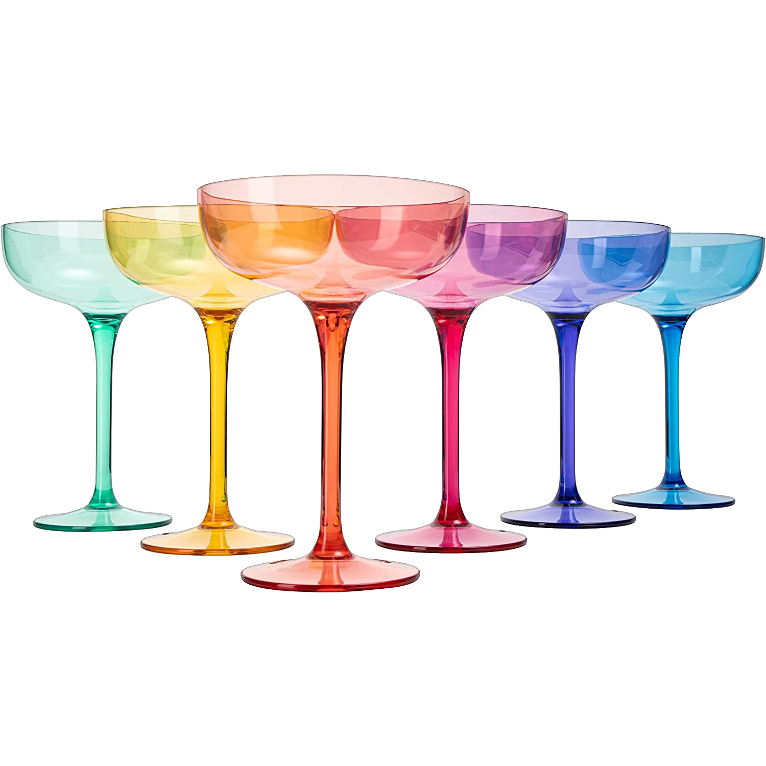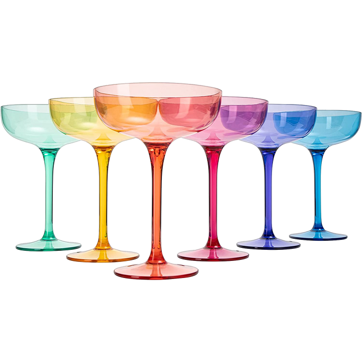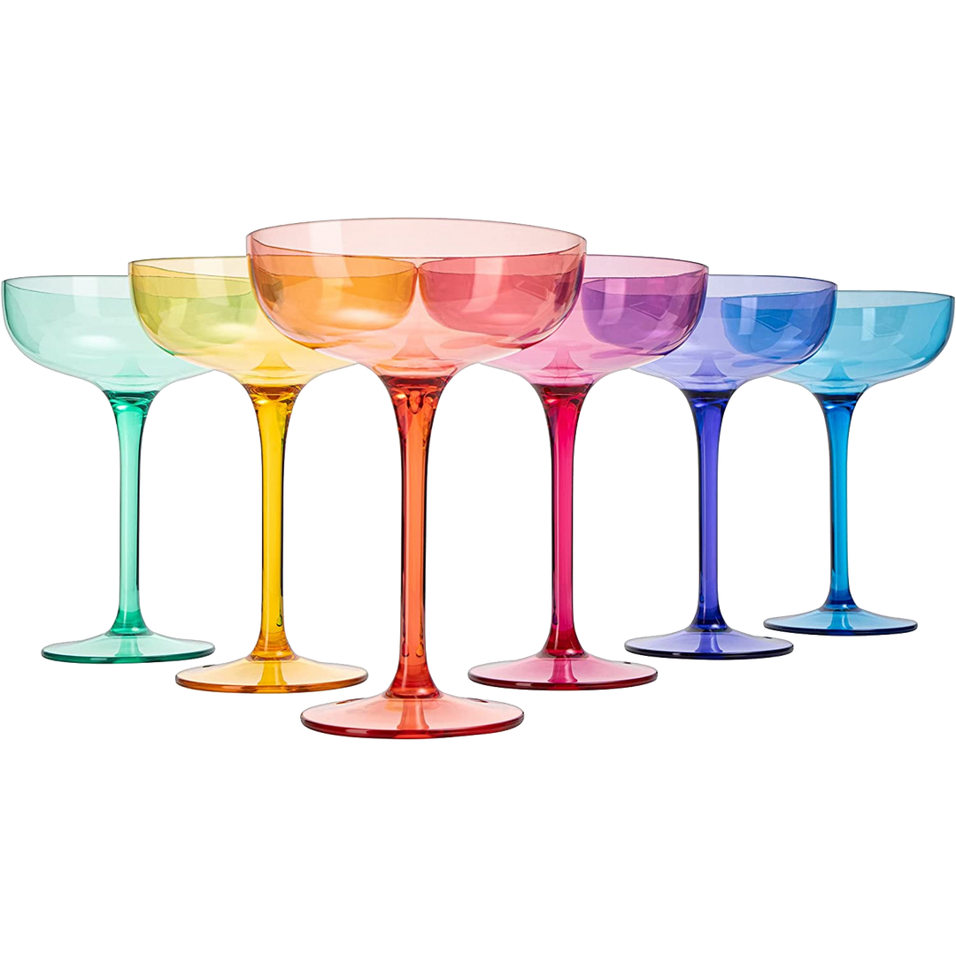 - This colored margarita glass set is a perfect way to add some pizzazz and fun to your party or celebratory event. Be sure to add these to your next pool party, or outdoor soiree; they’re easy to clean after the big day. Whether you're hosting a party or need something to decorate your home with, these colored wine glasses will be perfect. These cups are durable enough to last a lifetime, but also look great as art in your home decor.