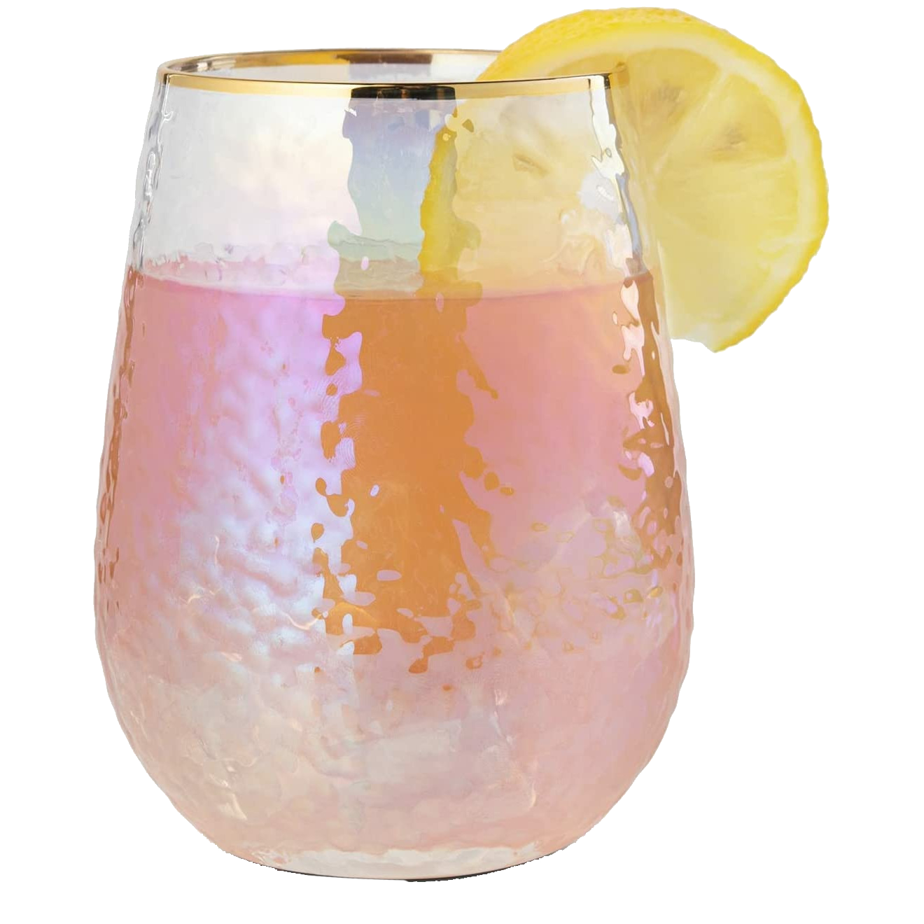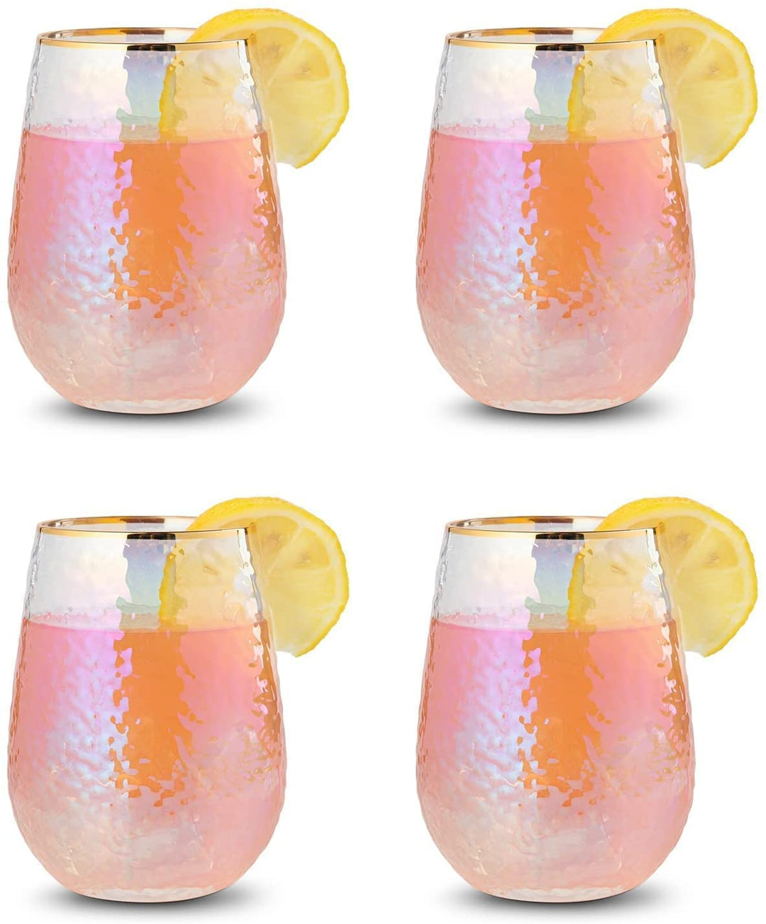 • These lustered stemless wine glasses are perfect for enjoying your favorite wine at home or toasting to a special occasion. Each glass is made of durable borosilicate glass with a lustered shine. Featuring a high-quality gold rim finish and the proprietary luster finish, it gives the glasses a bright sheen that shines in any light and make it a wonderful addition to any table.