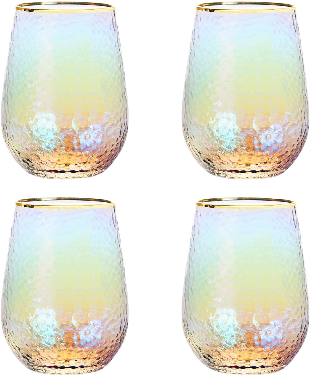Festive Lustered Iridescent Stemless Wine & Water Glasses - Set of 4-100% Glass 15oz Mouthblown Colorful Glasses - Anniversaries, Birthday Gift, Cocktail Party Radiance - Water, Whiskey, Juice, Gift by The Wine Savant
