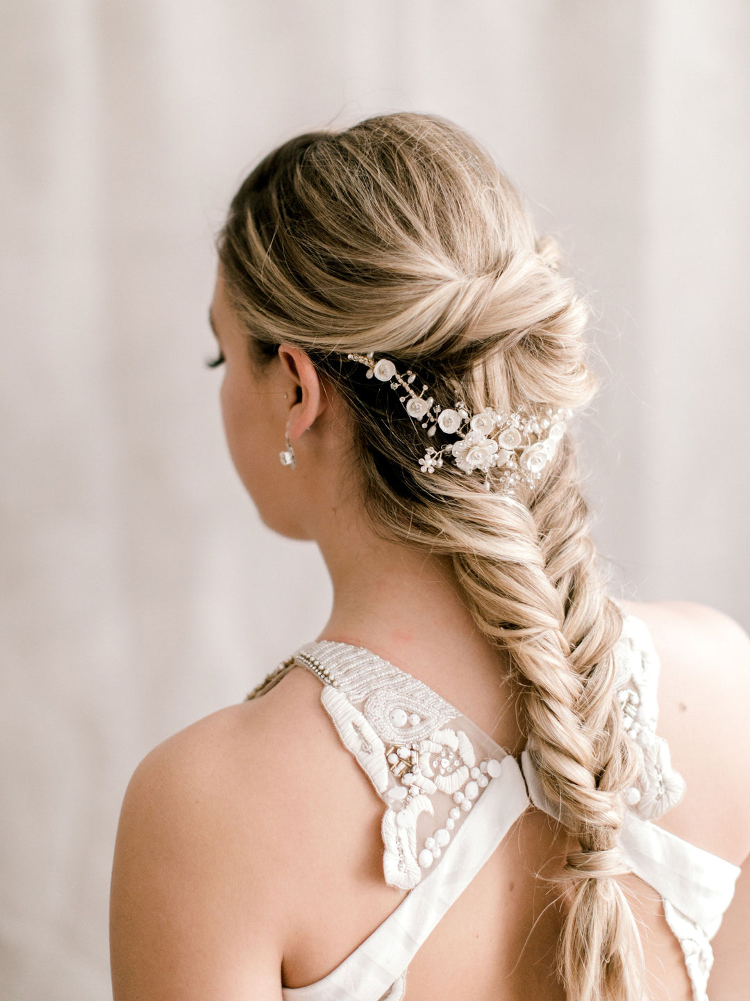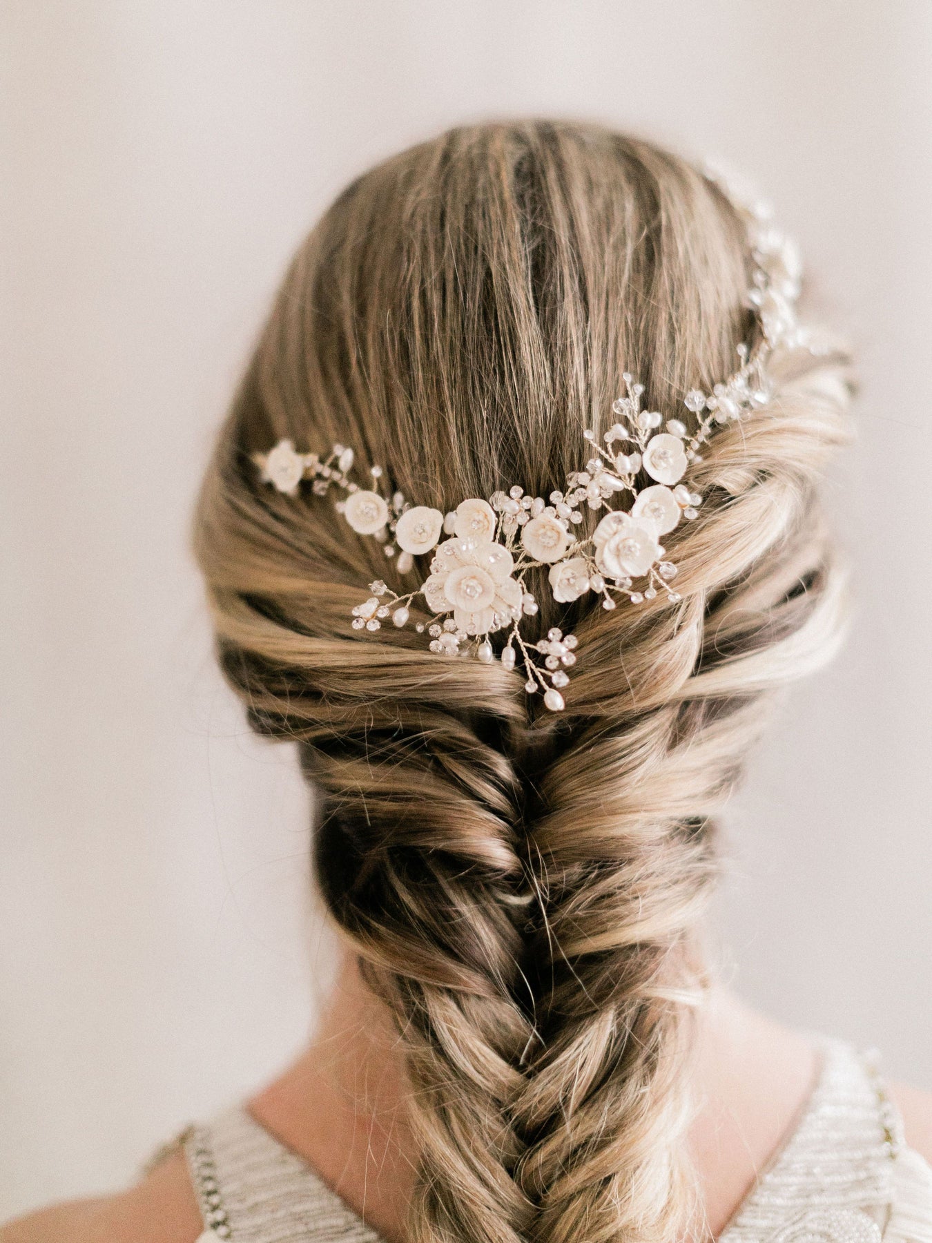 This Vine is a divine headpiece of clustered flowers, pearls and crystals. Finished with two alligator clips to fit and fold into any hair style.  We love the versatility of this piece!