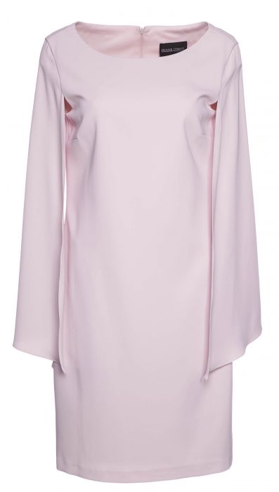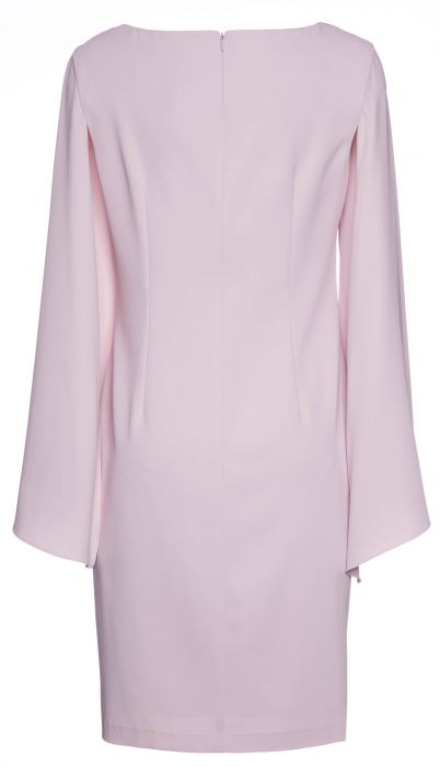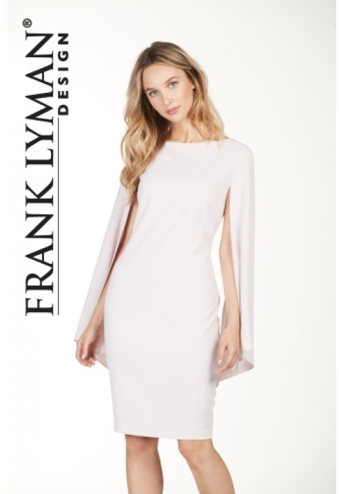 Gorgeous knit dress with flattering arm overlay. Rounded neckline with concealed back zipper. Hand wash cold water, overlay 100% polyester, dress 100% polyester. Fully lined and approx. 39 inches long, 2.5 inches on shoulder.