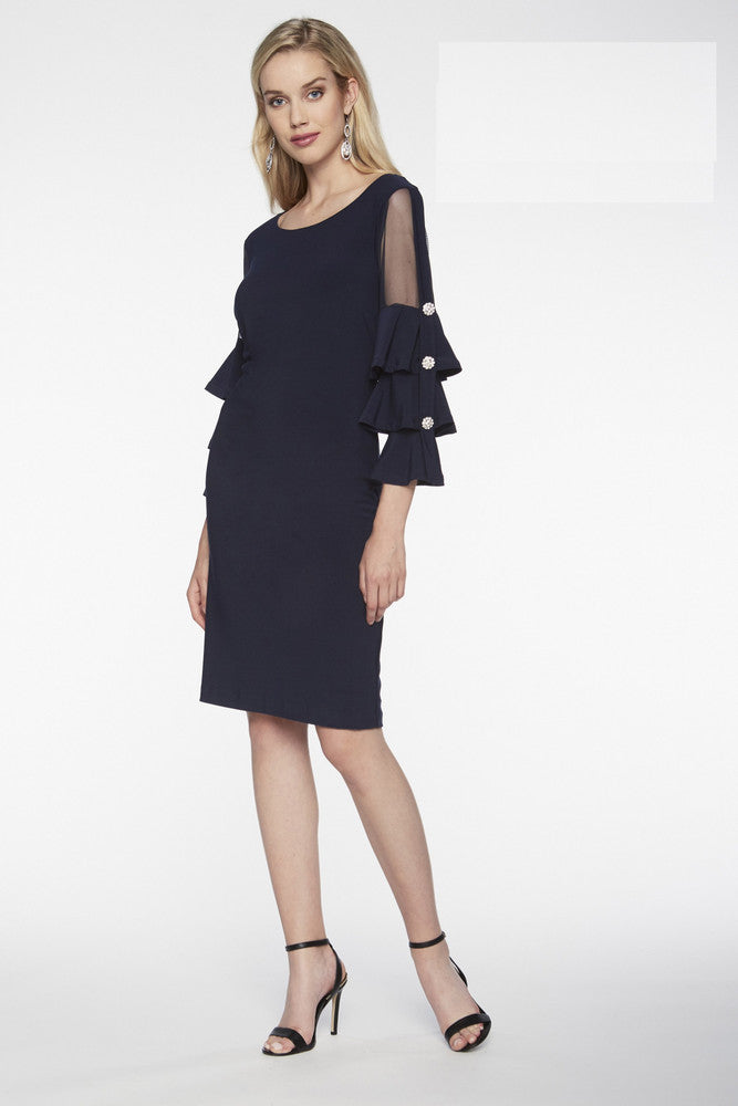 Elegant evening cocktail dress with sheer ruffled silver crystal embellished detail on sleeve. Rounded neckline front with concealed back zipper. Hand wash cold water, dress 92% polyester, 8% elasthane. Fully lined and approx. 40 inches long, 20 inch sleeve.