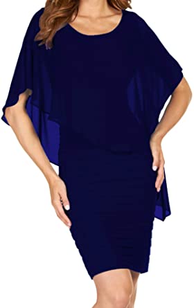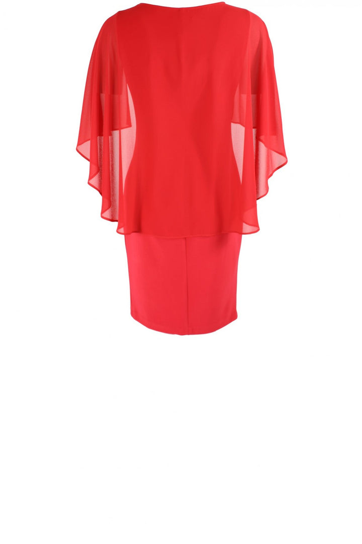 Elegant, sleeveless knit cocktail dress with sheer cape covering the shoulders and lower back, attached to the front of the collar with a zip detail.  The third photo is just to show the color option the dress is available in.
