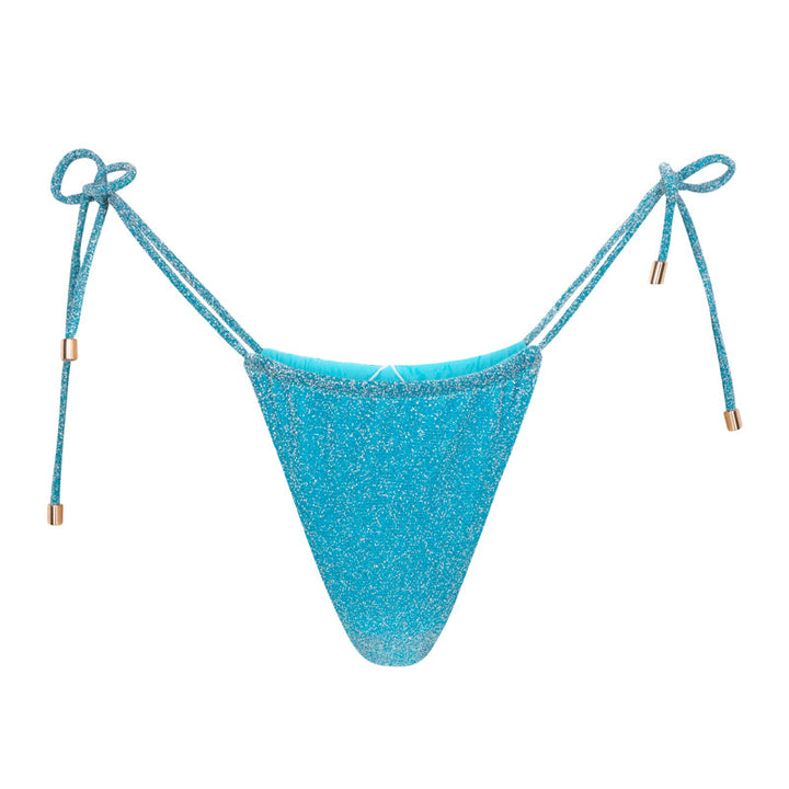 A side-tie bikini in blue glitter fabric. Fully adjustable bottoms with self-tie fastenings.