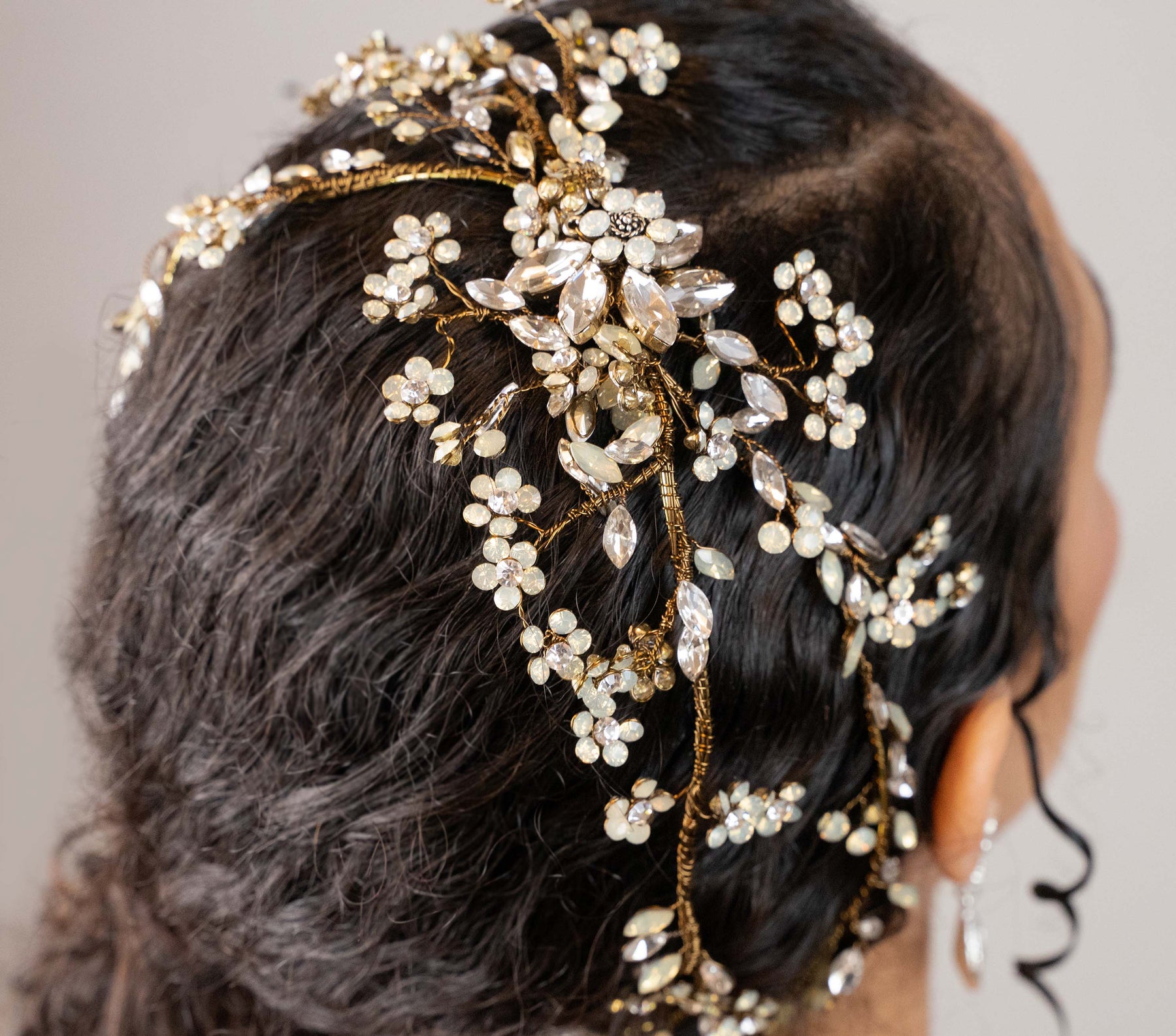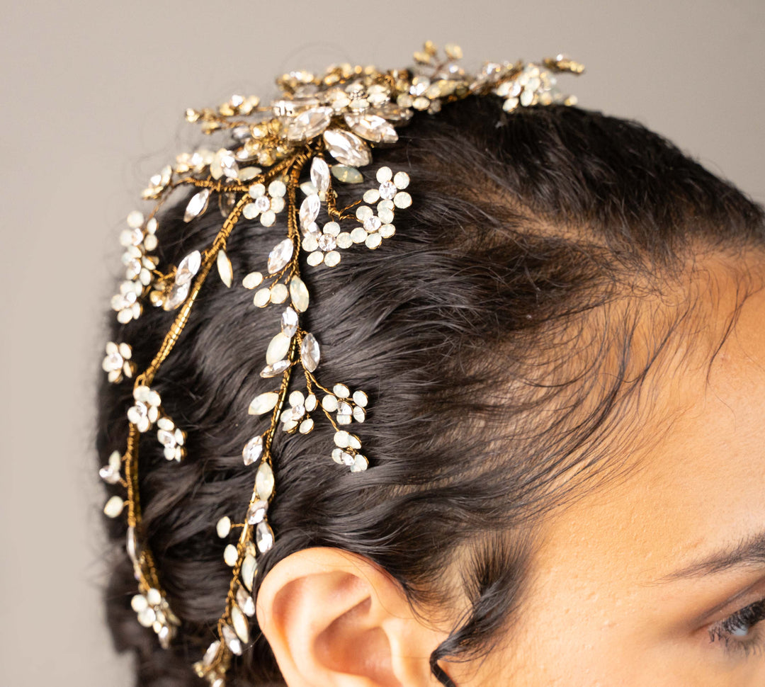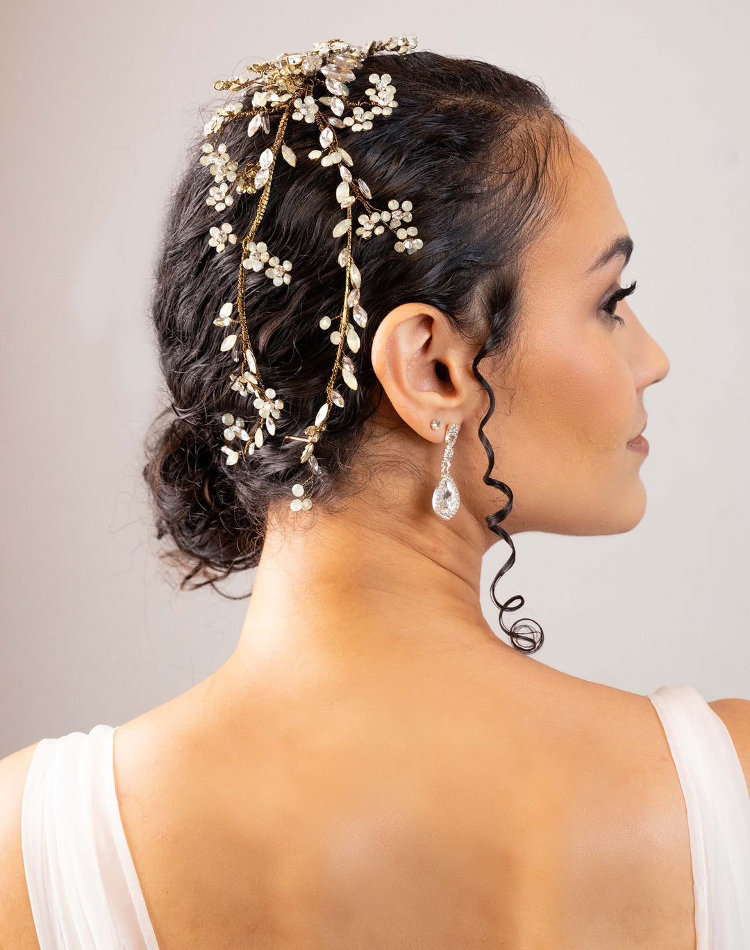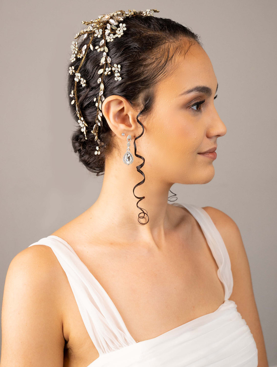 Add some whimsy and romance with this statement hair vine.  This attractive headpiece offers pliability and can be worn whichever way you's like.