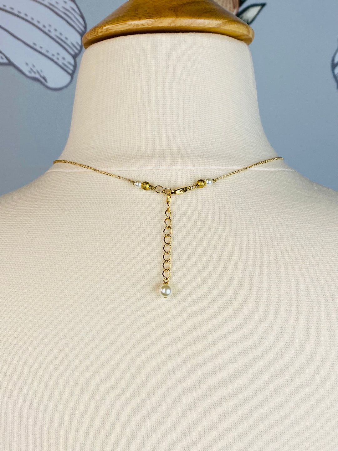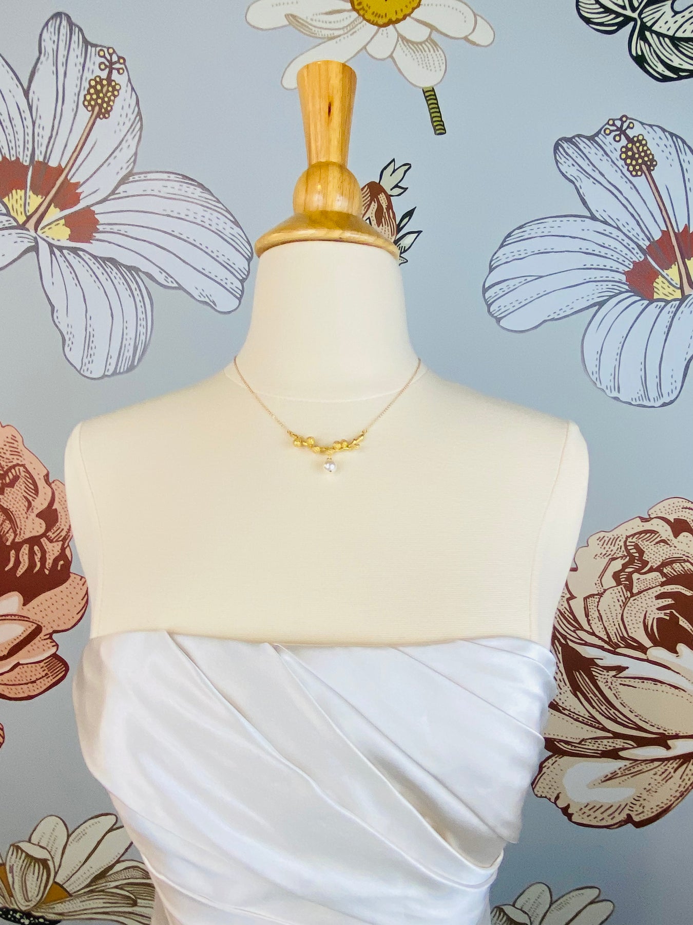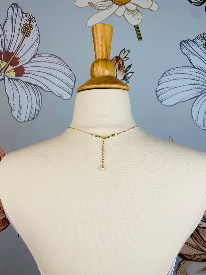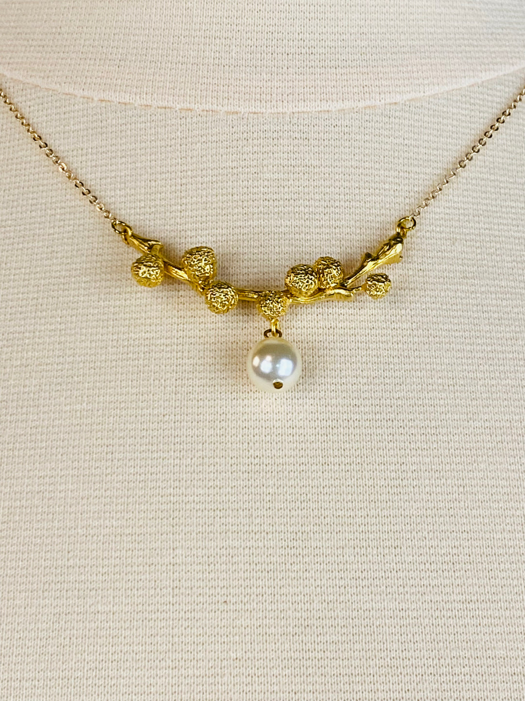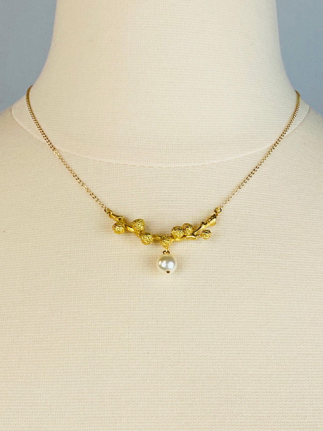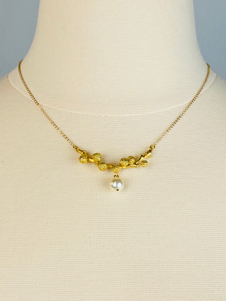 This dainty gold-toned necklace is anchored with a branch design and center pearl to complete the look.