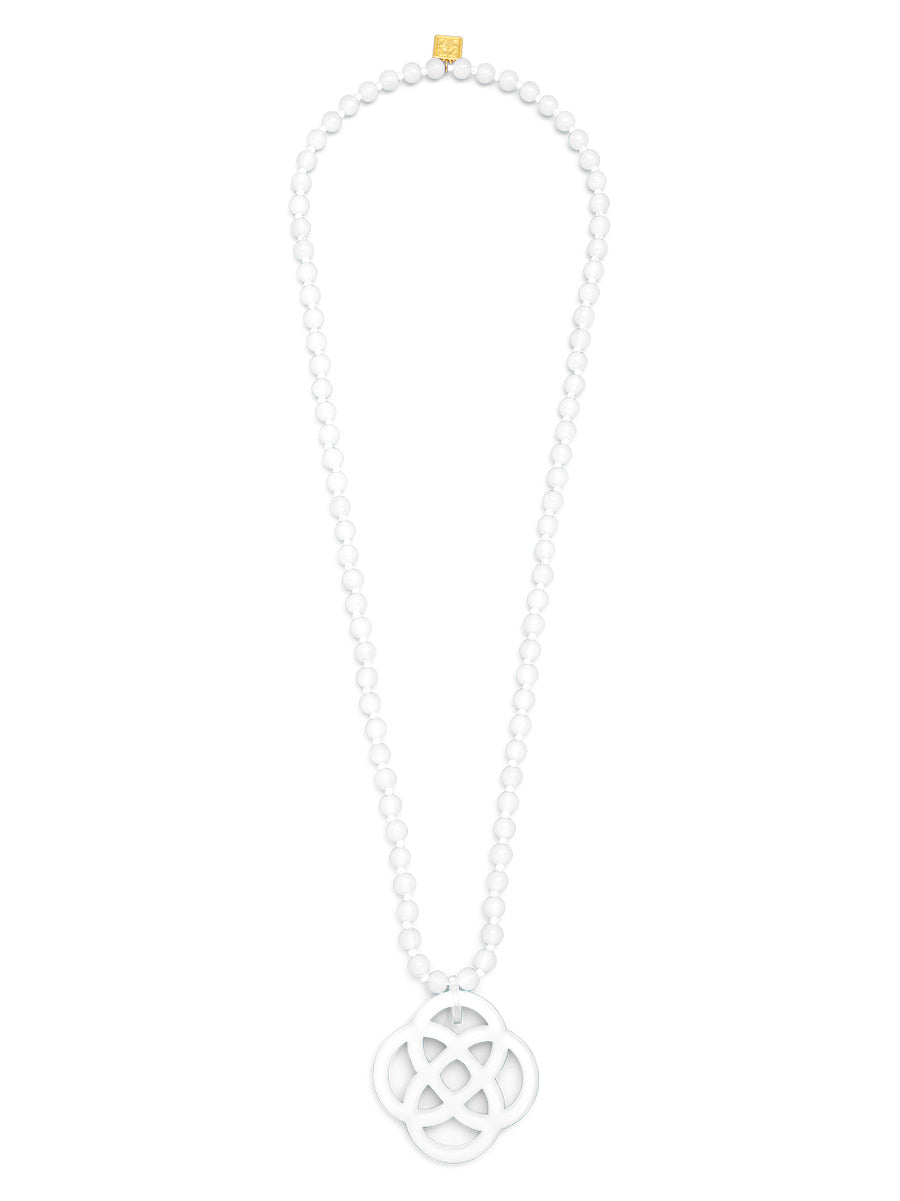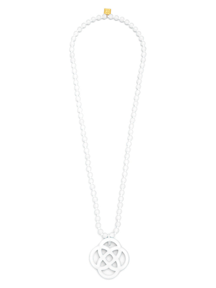 The classic quatrefoil charm should be in everyone's jewelry box. Long with glass beads, Grace styles well with a t-shirt for elevating a casual look.