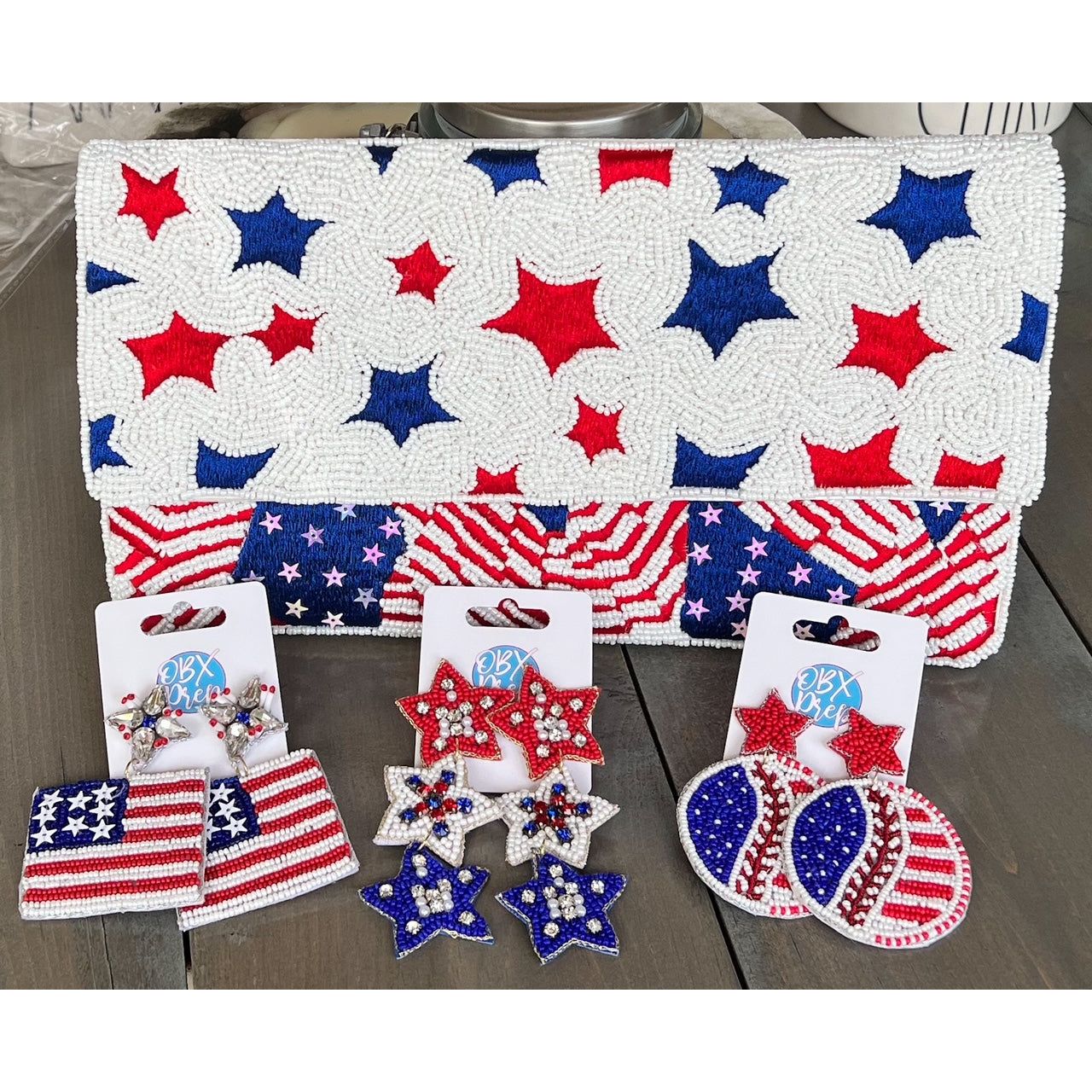 Show off your love for the stars and stripes with these handmade seed beaded earrings! Featuring a patriotic theme, these dangle earrings are made with a felt back and post closure for easy wear. Measuring 1.5" by 3.6", these earrings are lead and nickel compliant and hand sewn by our talented artisans.