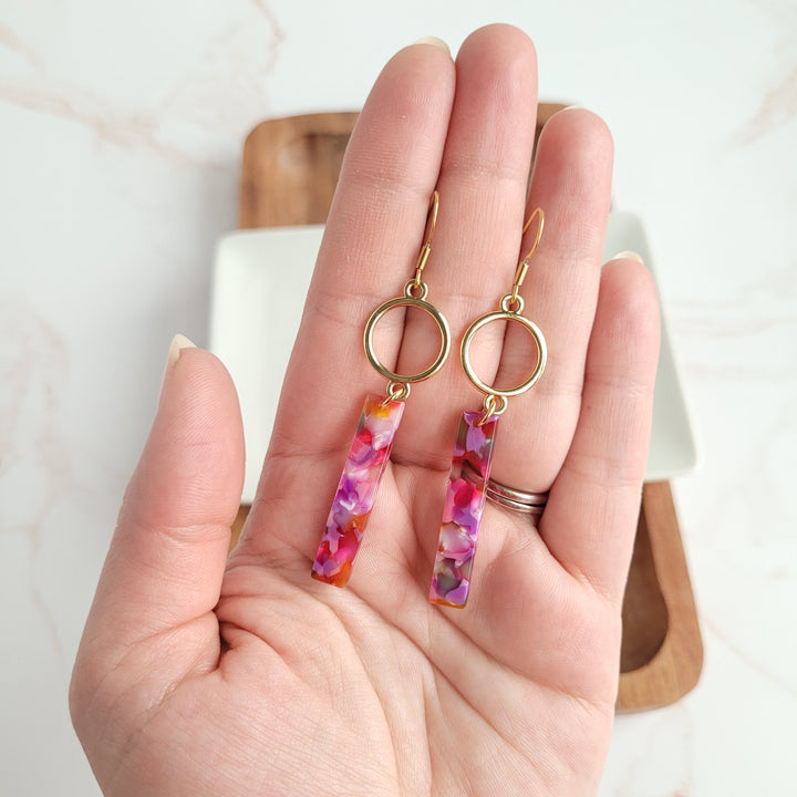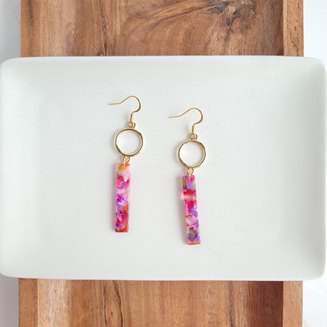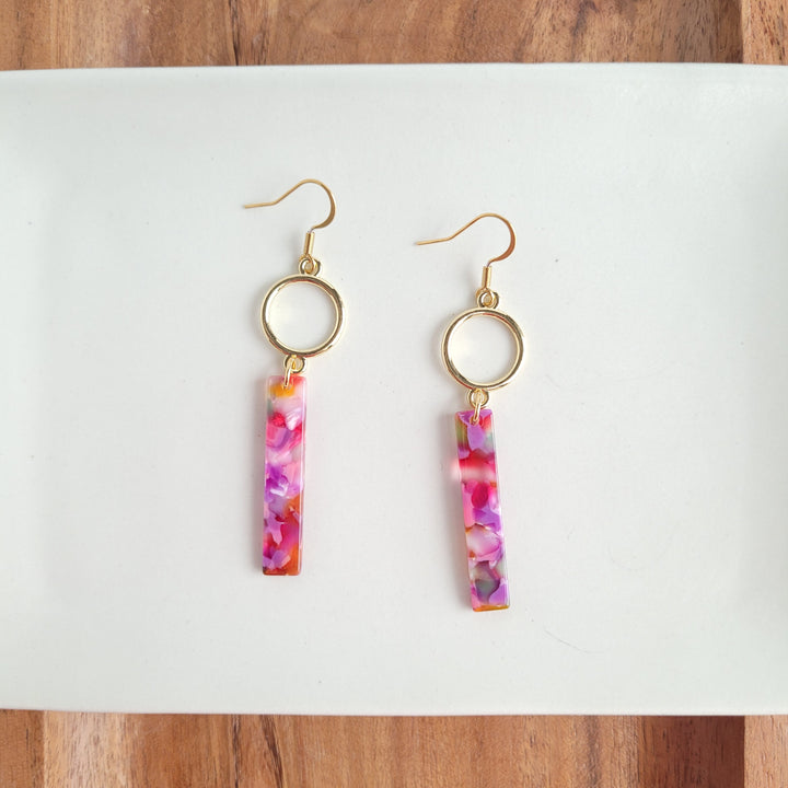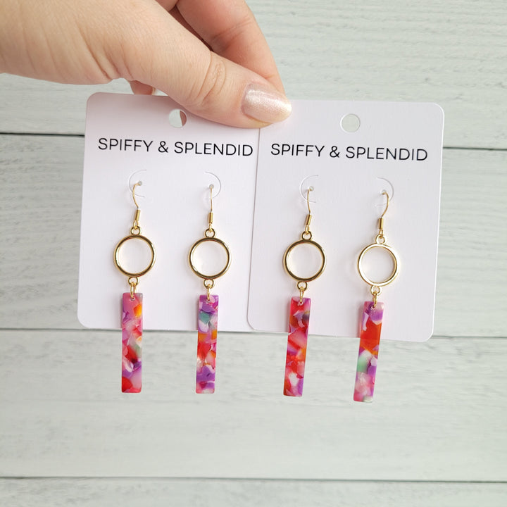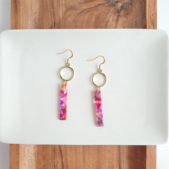 These lightweight drop style earrings feature gold alloy circles and rectangle acrylic charms. A perfect addition to any outfit, these simple earrings are sure to add that little something special to your style.