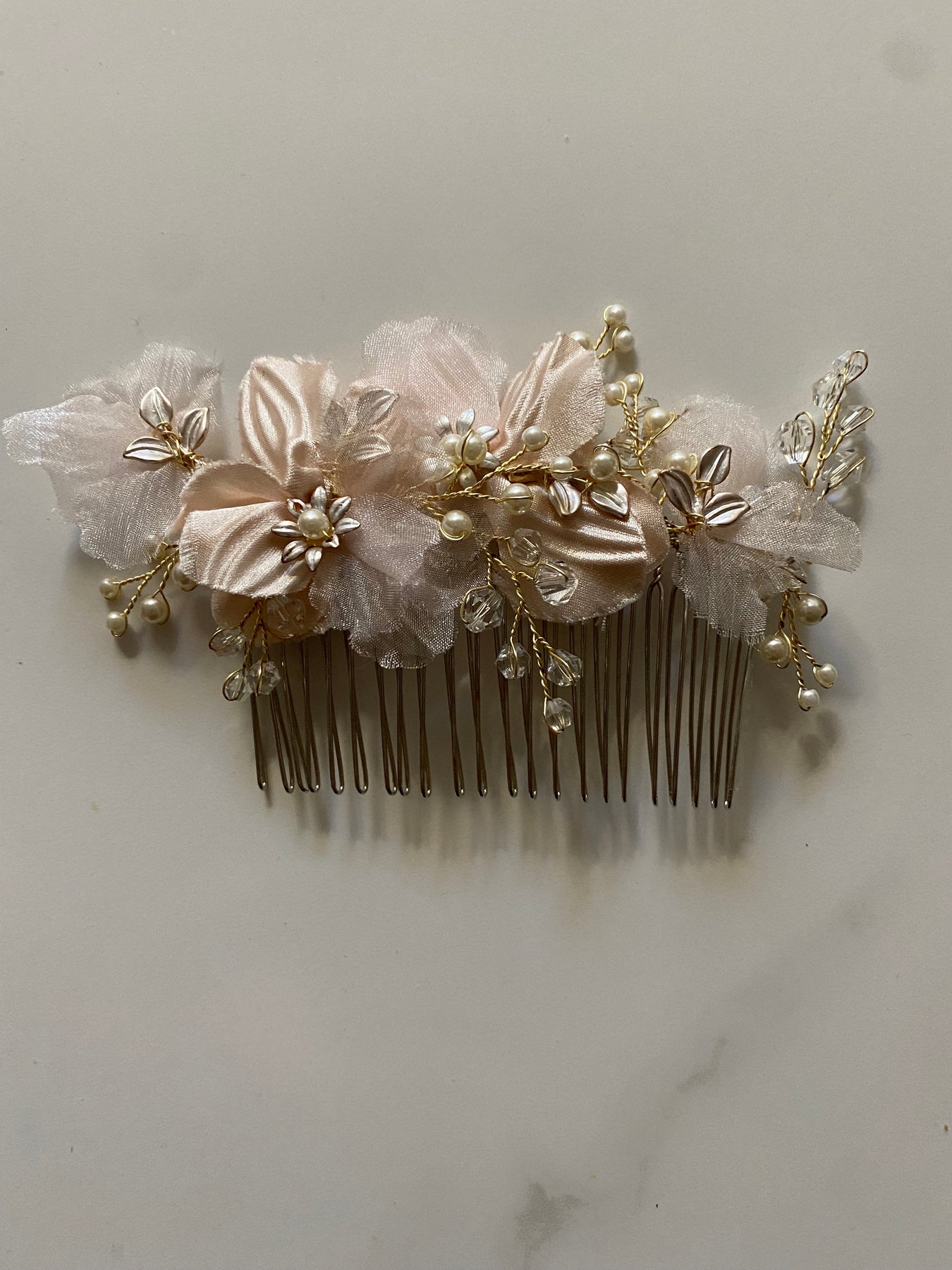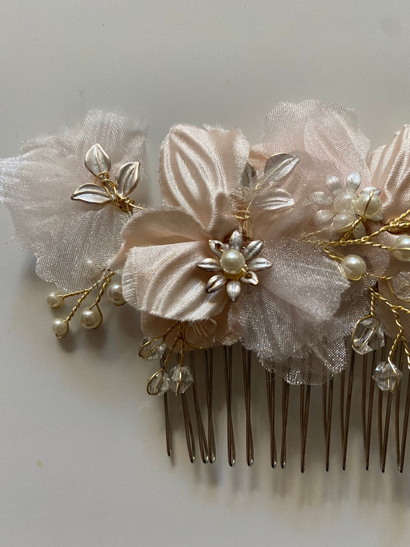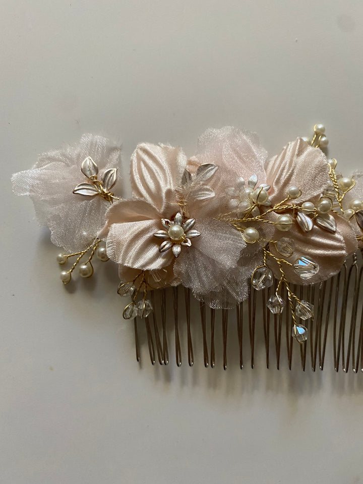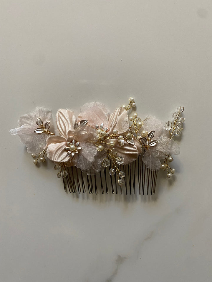 An exquisite vintage inspired comb with blush satin and organza floral details, imitation mini pearls and gold stemming. This comb offers blush, ivory, rose gold and gold tones.