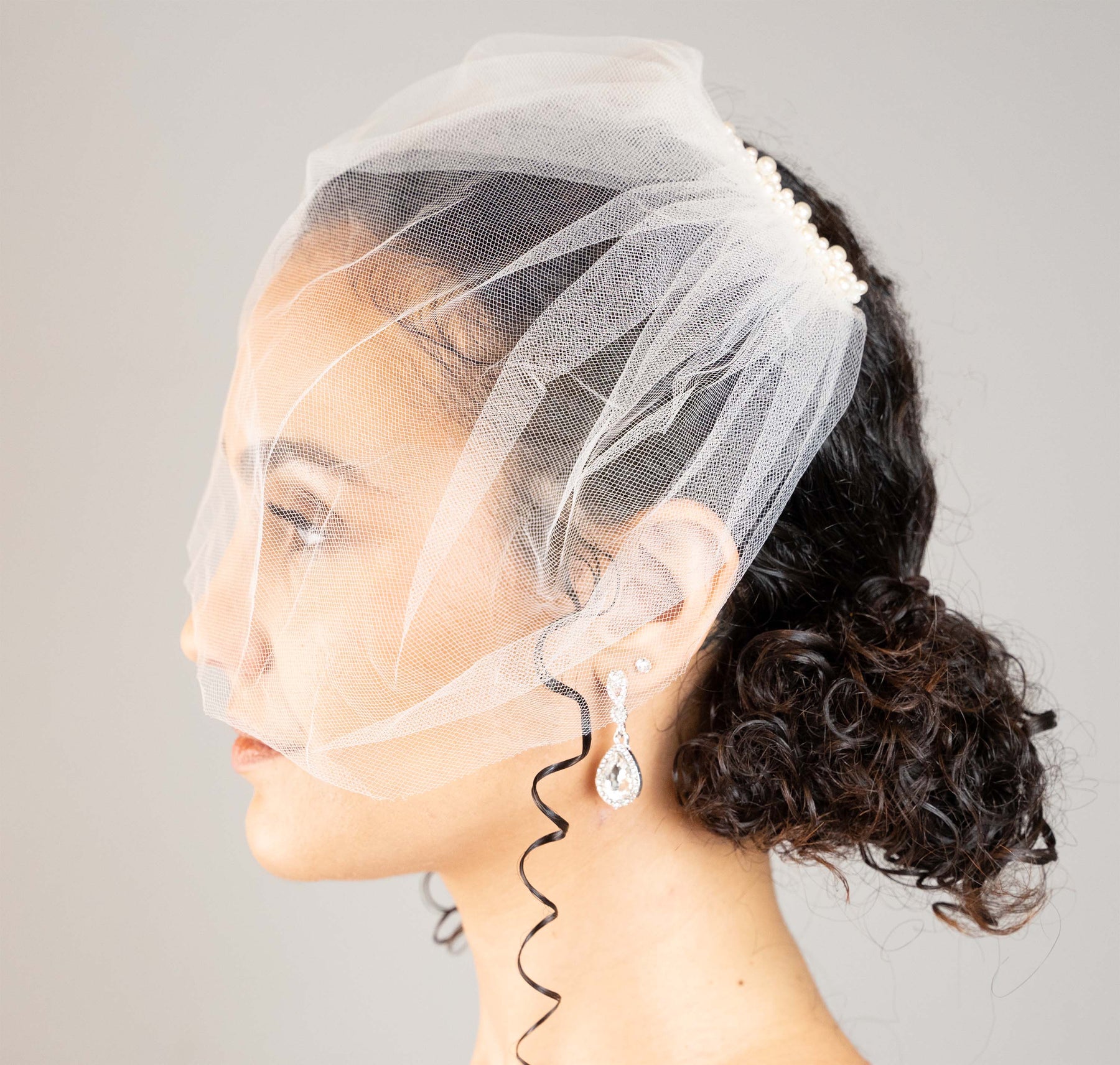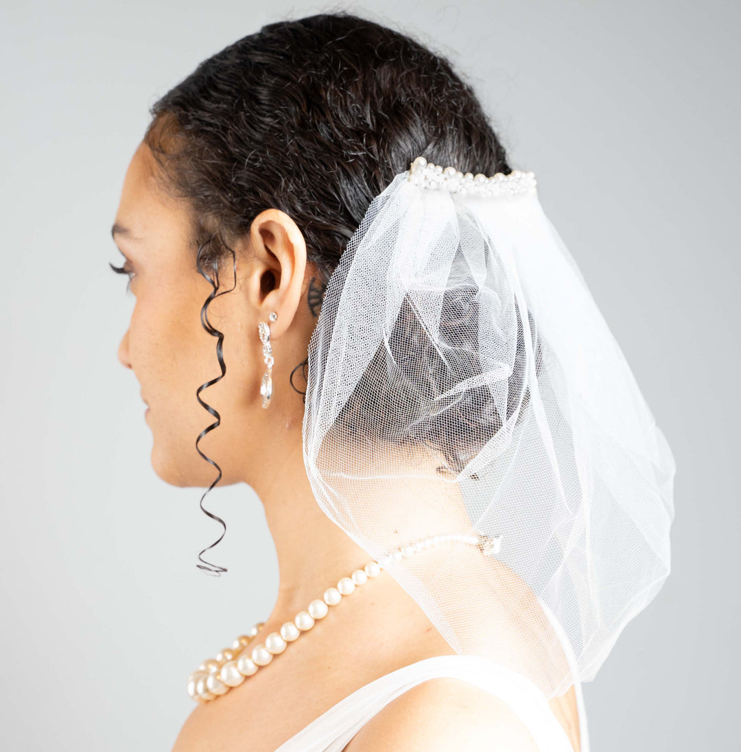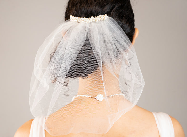 A simply darling tulle birdcage veil with a double row of pearls affixed to the come.  Can be worn as a classic birdcage veil or a "mini" veil.