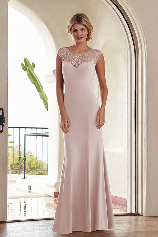 Matte Jersey gown with a beautiful boat neckline and beading details. Cap sleeves, high back neckline and a flare skirt silhouette completes this look.  The main photo is the color of the one being sold (sweat pea).