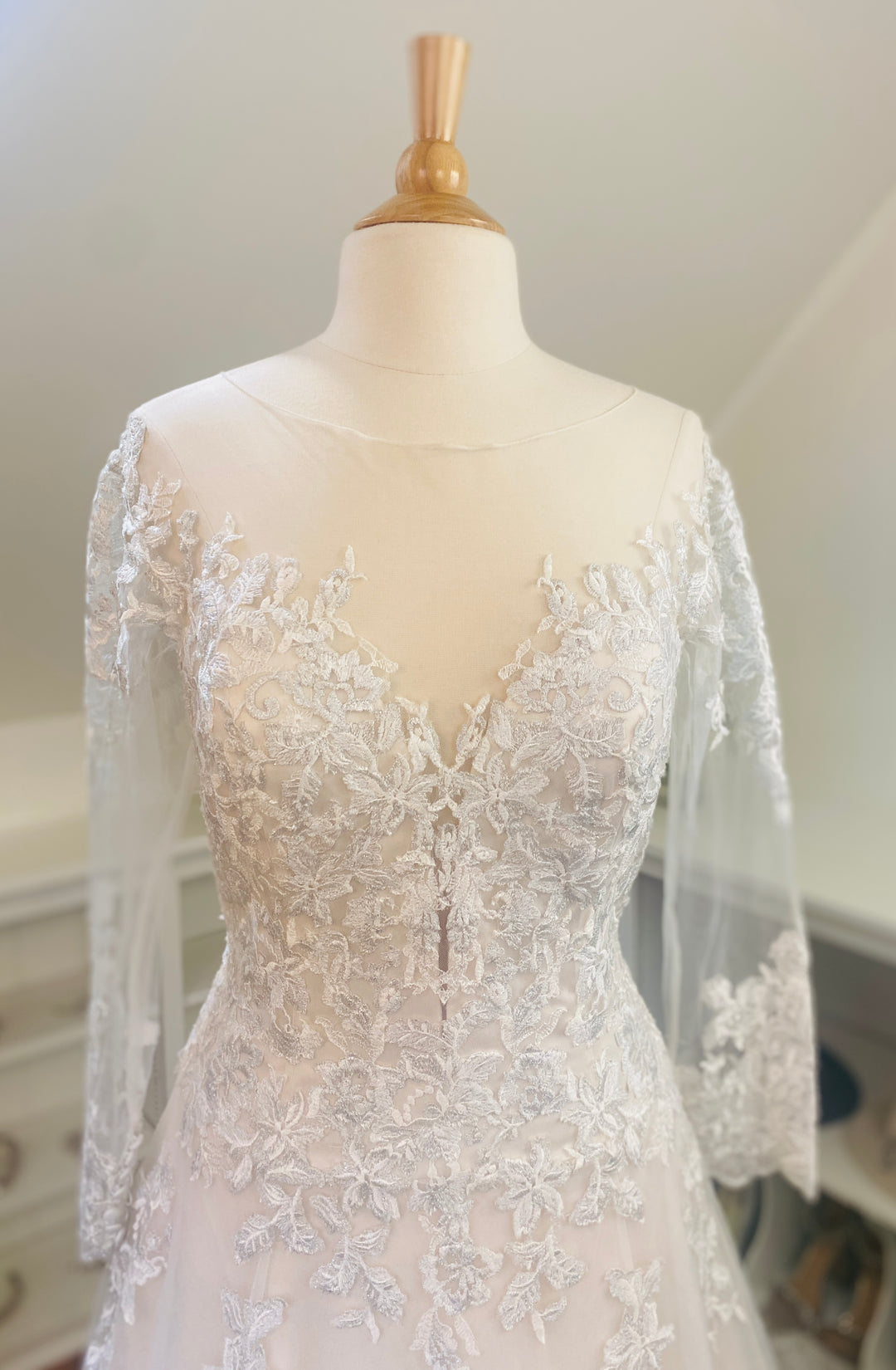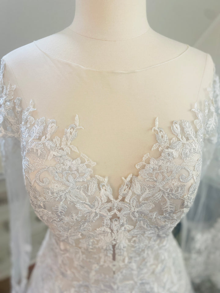This timeless long sleeve couture gown features intricate details and a sweetheart neckline to create an exquisitely tailored design. Sleek lace appliques and a button-embellished illusion back lend a sophisticated touch and sure-fire show-stopping impact.