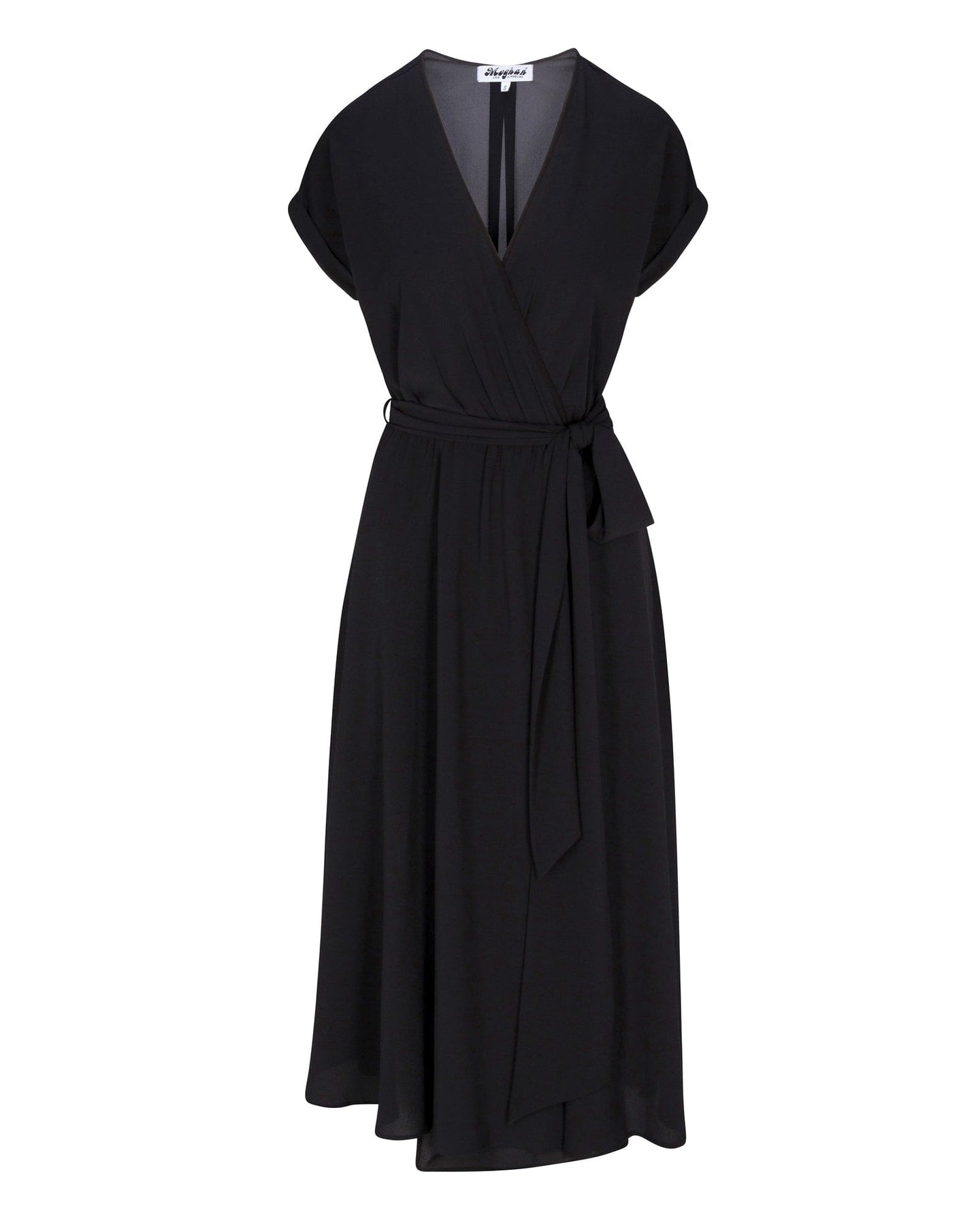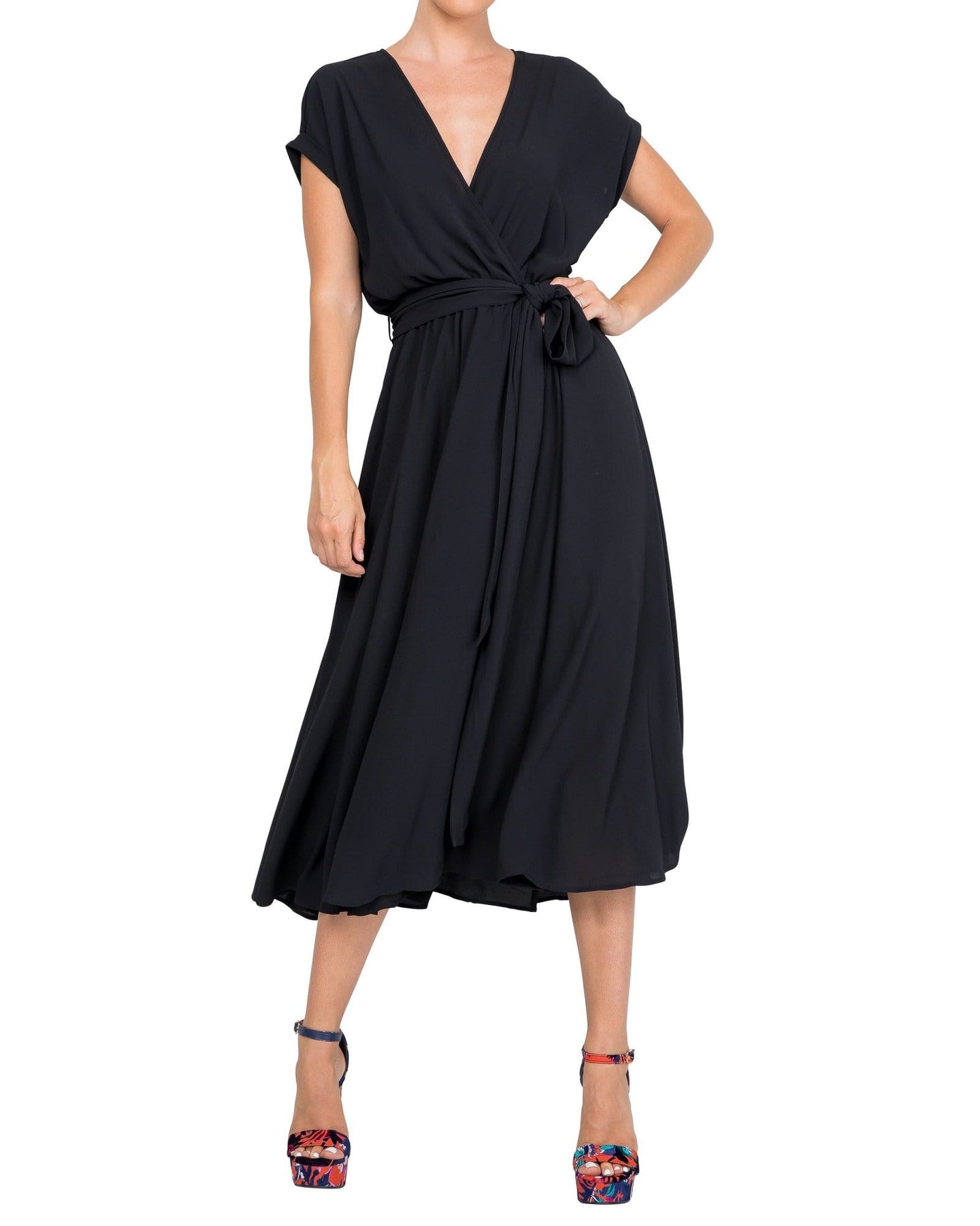 This 70s inspired midi dress features a sexy cross front V-shaped neckline and capped kimono-inspired rolled sleeves.