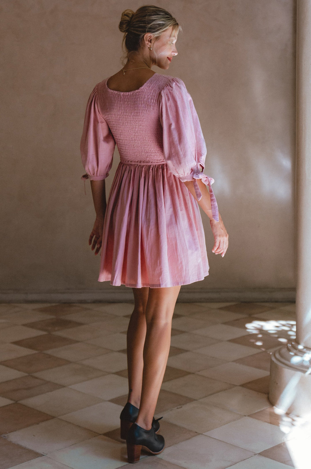 Handmade from soft and breathable crinkle linen our romantic Jolie mini dress is adorned with round neckline and puff sleeves. The smocked bodice offers perfect fit falling into a voluminous mini skirt.