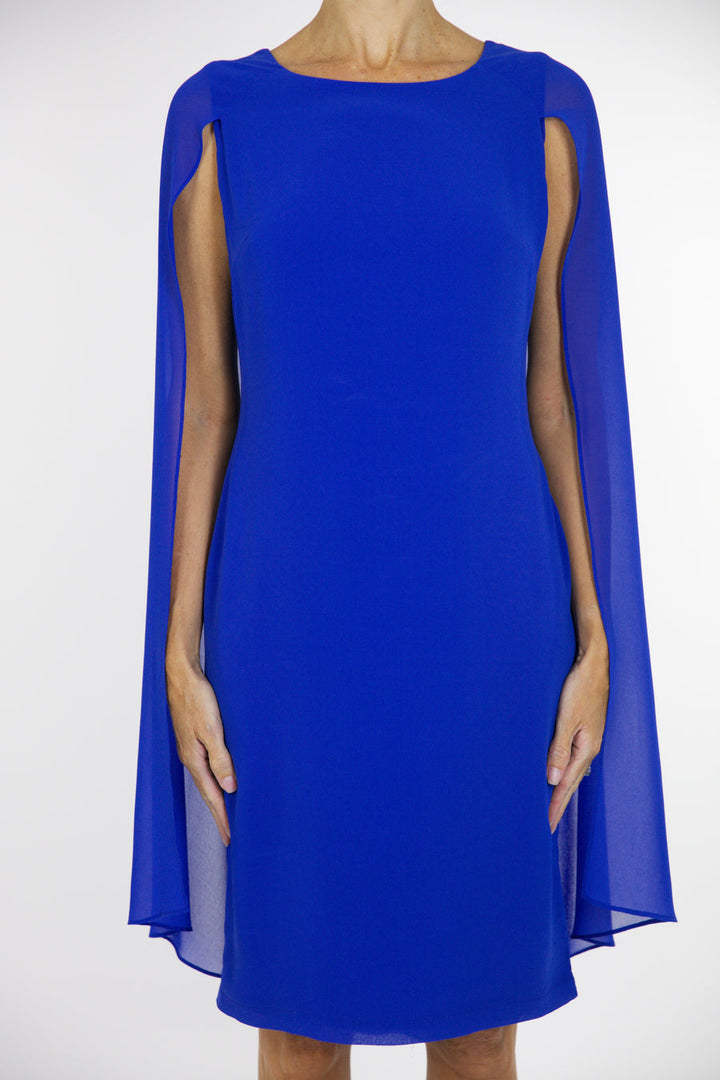 This dress offers up understate drama with the chiffon attached cape.