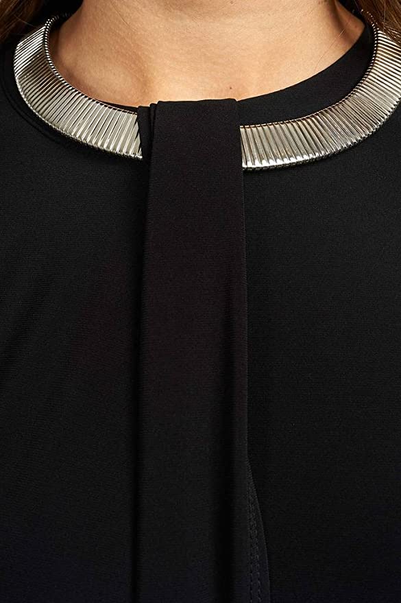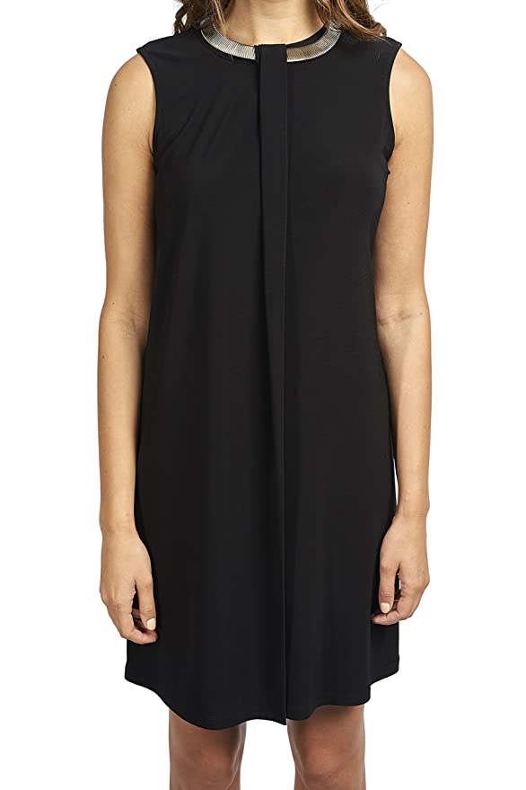 • This knee-length, Joseph Ribkoff shift dress features a metallic, choker-style collar with a fabric, neck-tie detail that drapes across the bodice and skirt