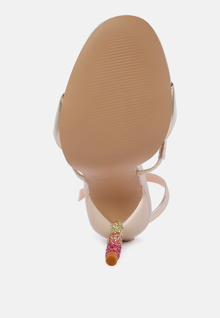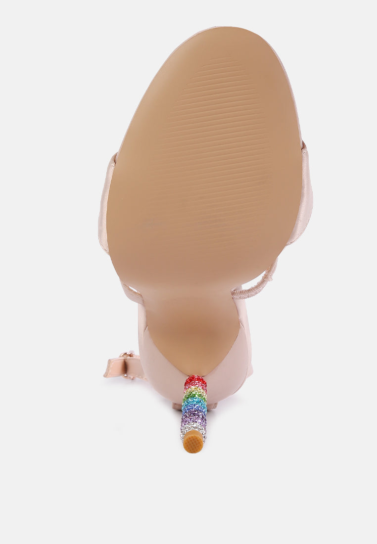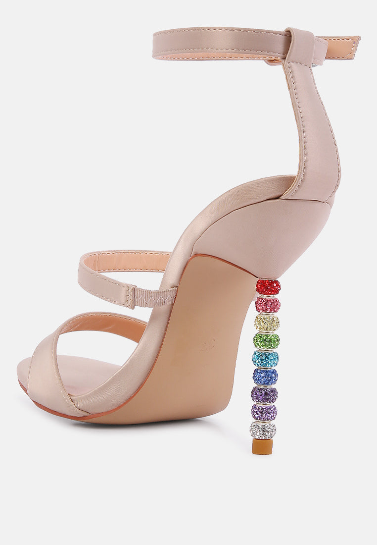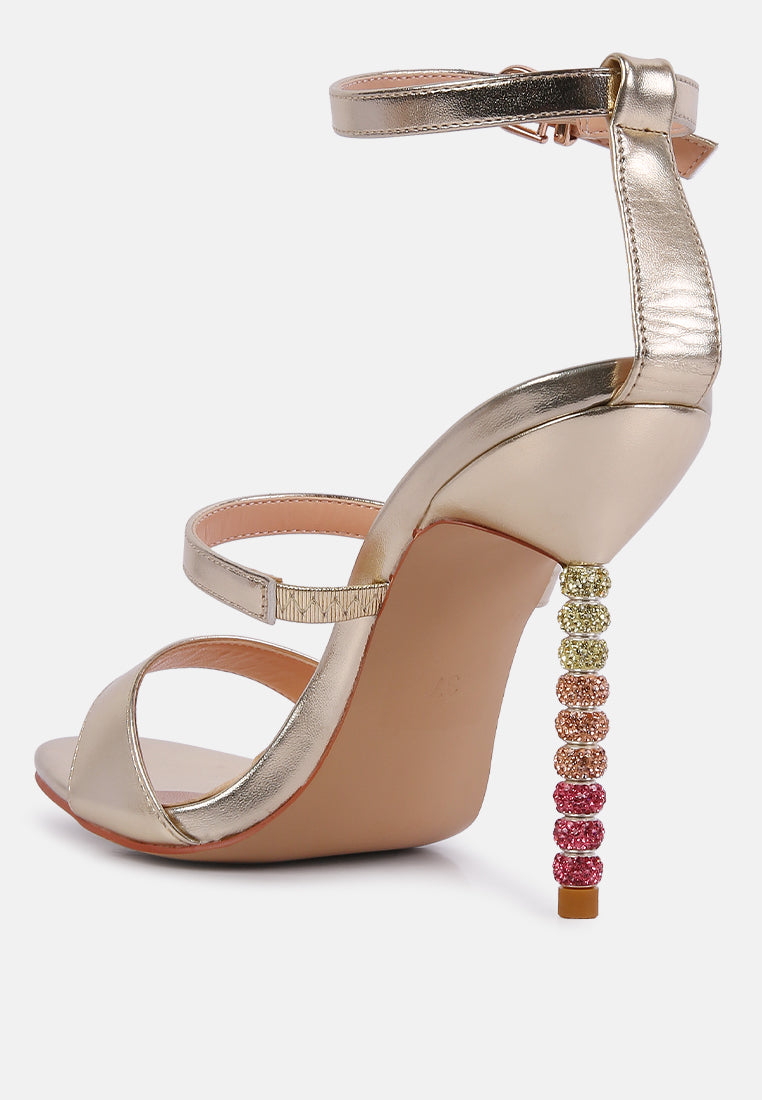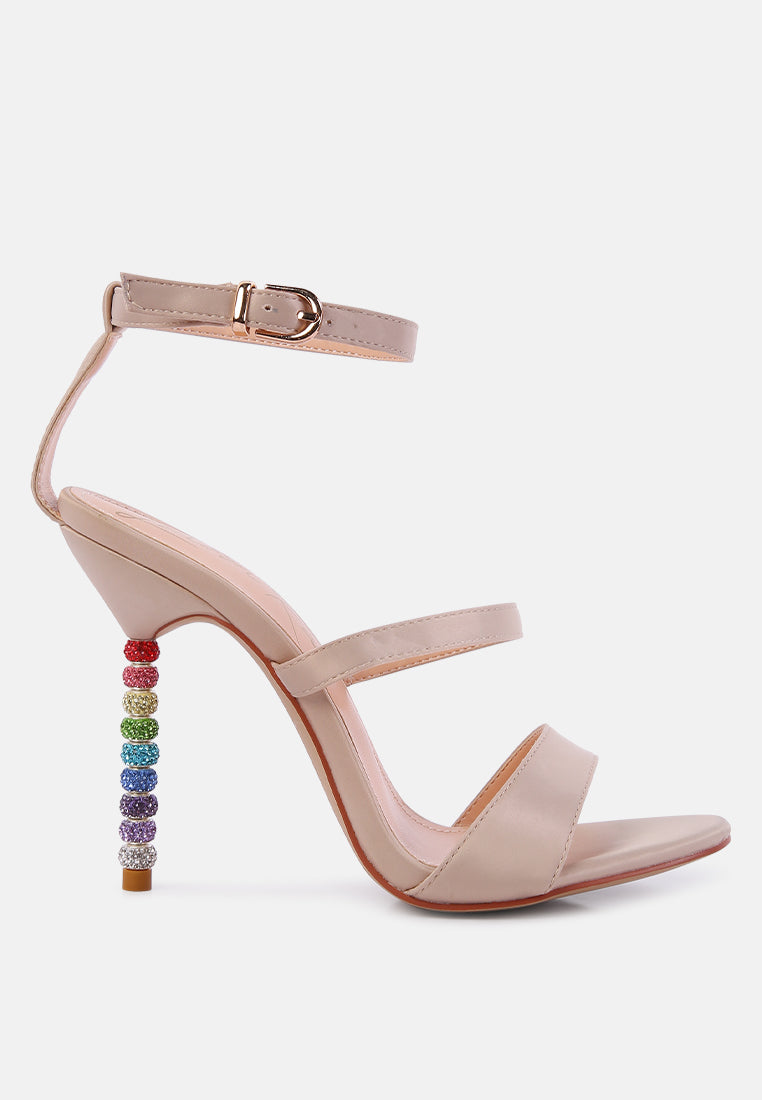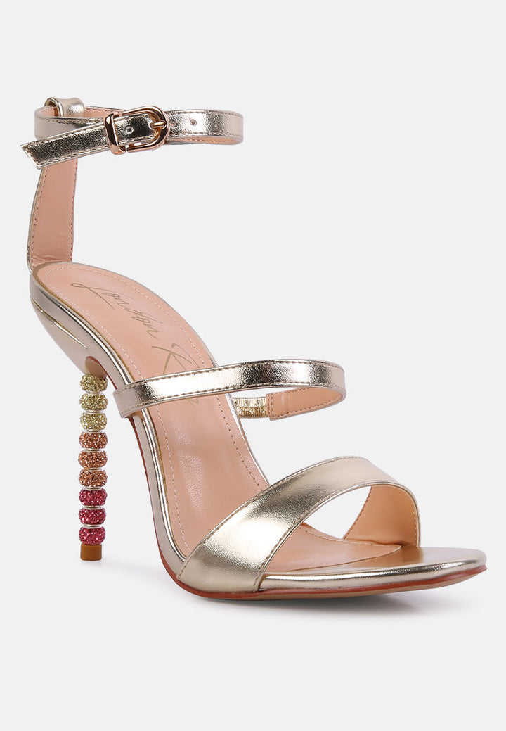 These are not your typical heels; they are very unique rhinestone beaded fantasy heeled sandals that feature three straps for a secure and comfortable fit. With their eye-catching design, these heels are sure to turn heads and make a statement.