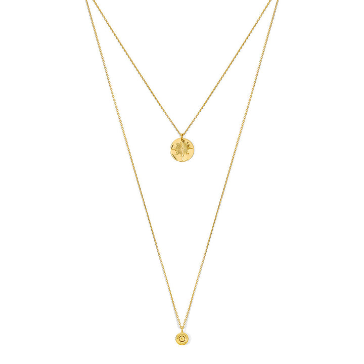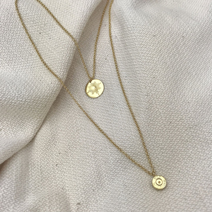 This statement recycled bomb and bullet necklace is the perfect mix of edgy and delicate. It features two layered chains adorned with a bullet fragment and a north star pendant.