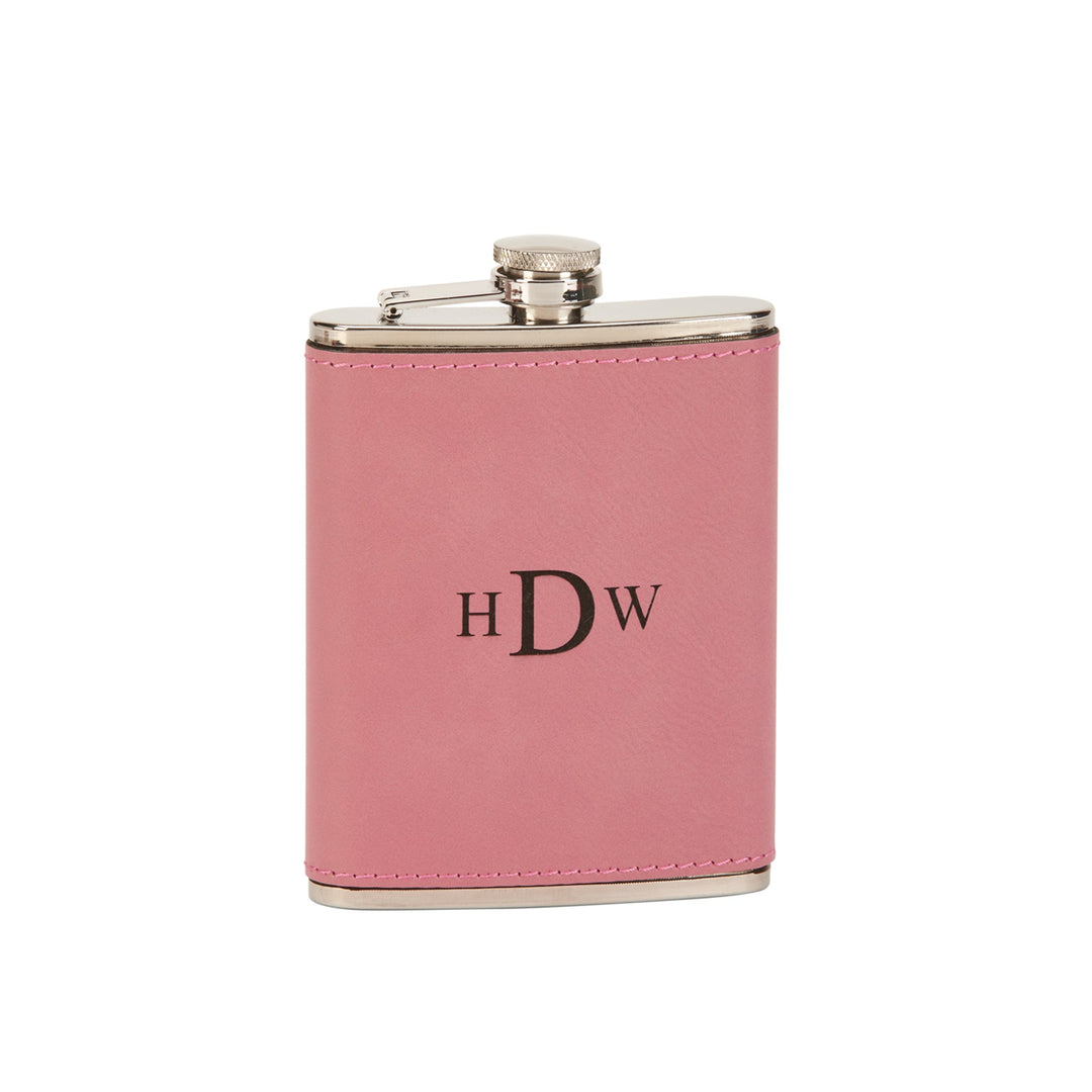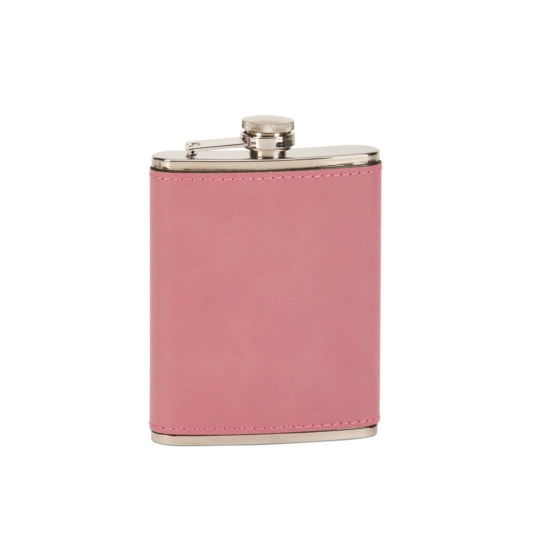 Sip in style with our Pink Leatherette-covered steel flask. At 5.25" H, it's perfect for your pocket or purse. Laser-engravable, hinged top, and gift boxed.