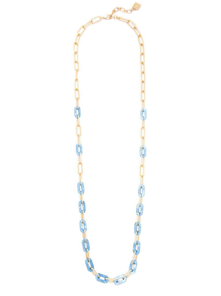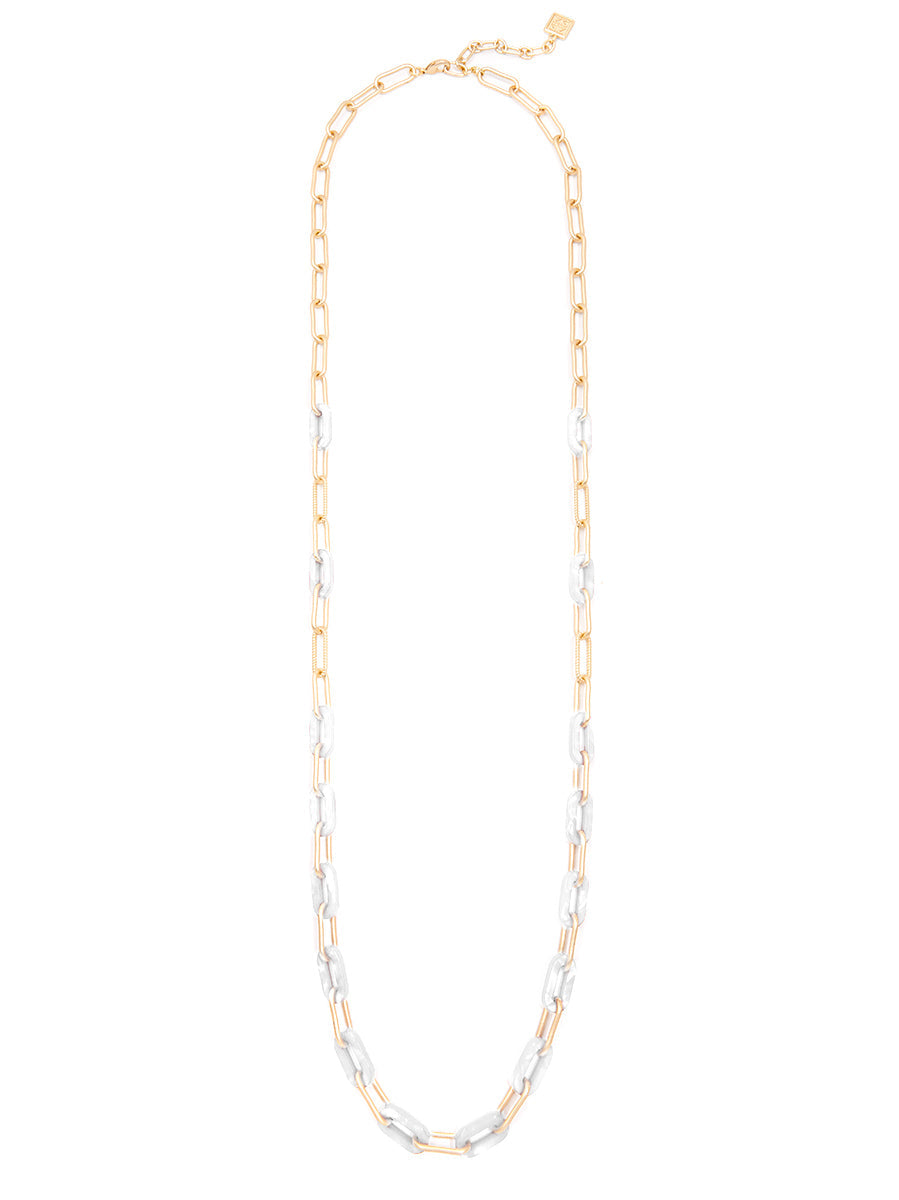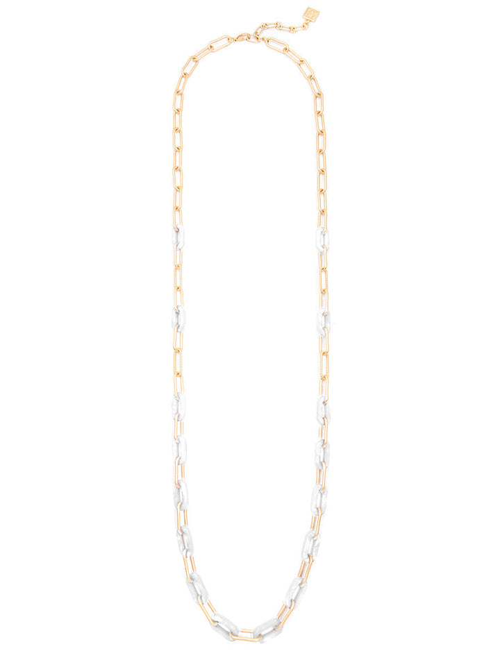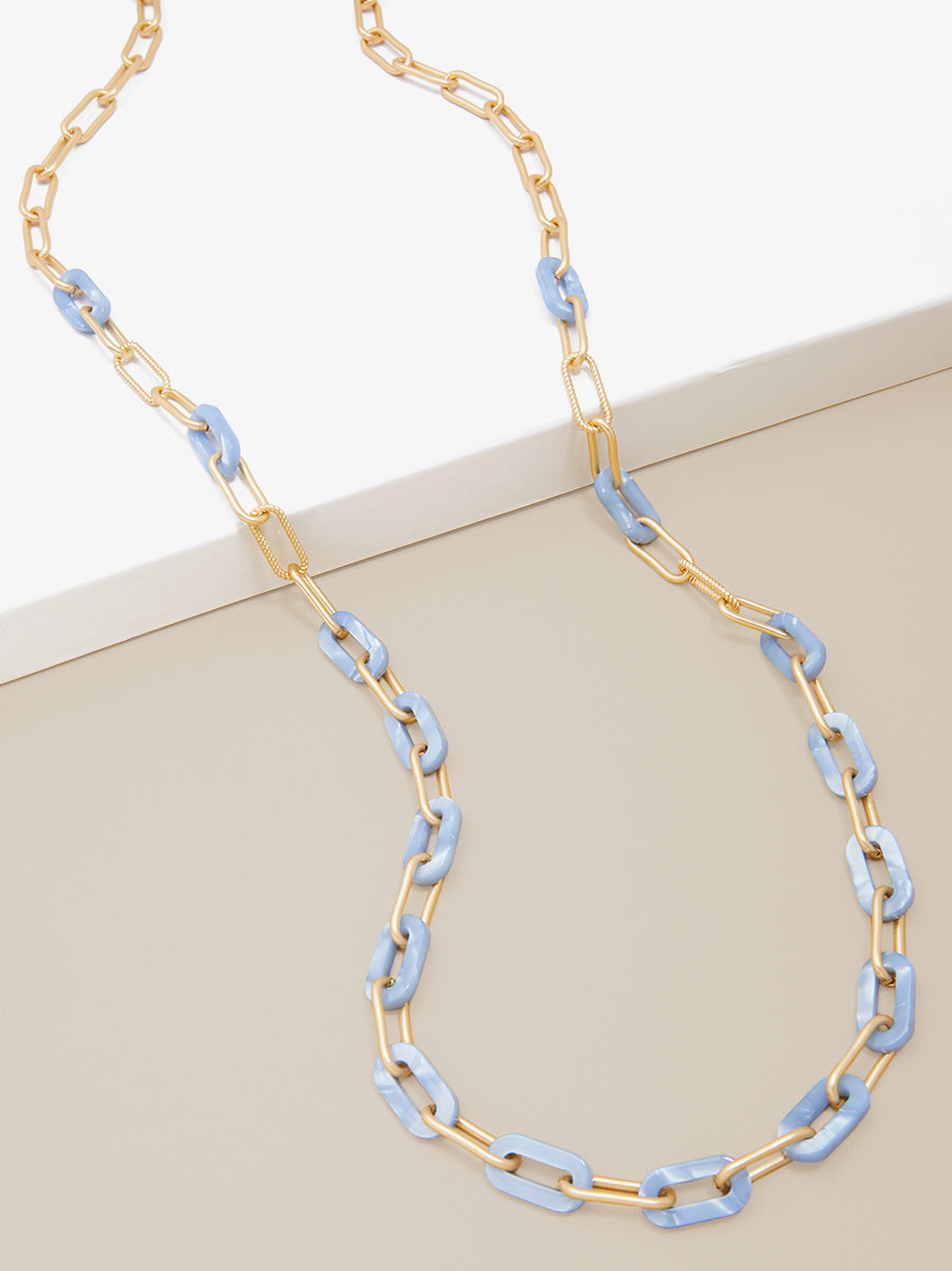 Why should you have to choose between showcasing your love of color and your love of links? You don't any more! This mixed media necklace features marbled resin and 18K gold-plated paperclip links and is finished with a lobster claw closure. Pair with other matte or shiny link necklaces for a flawless layered look.