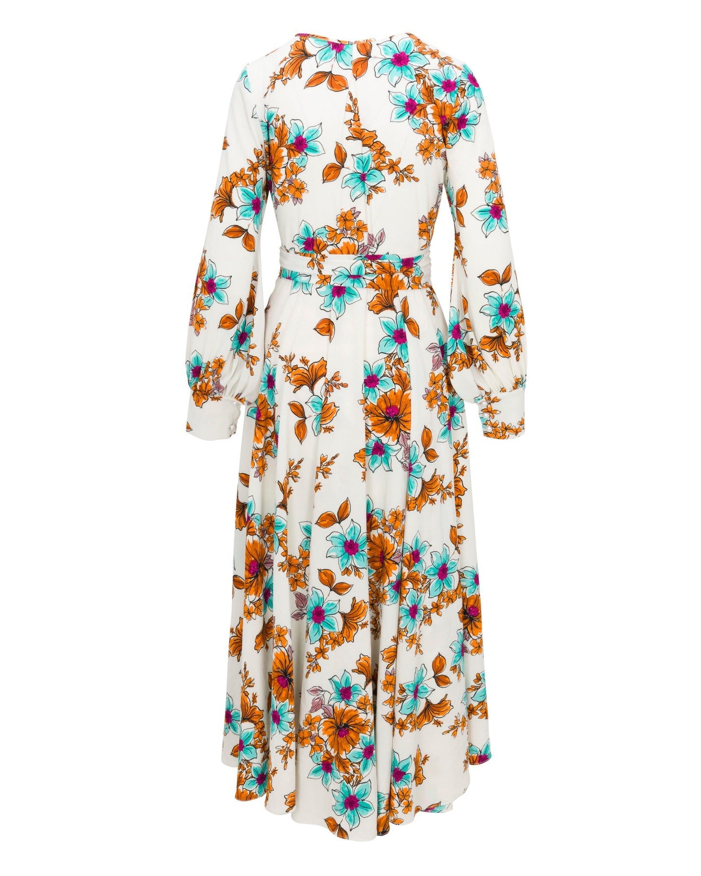 The elasticized waist adjusts to fit a range of sizes and has an attached self-tying belt at the right-hand side seam. The cuffed bell sleeves add a hint of retro glamour.