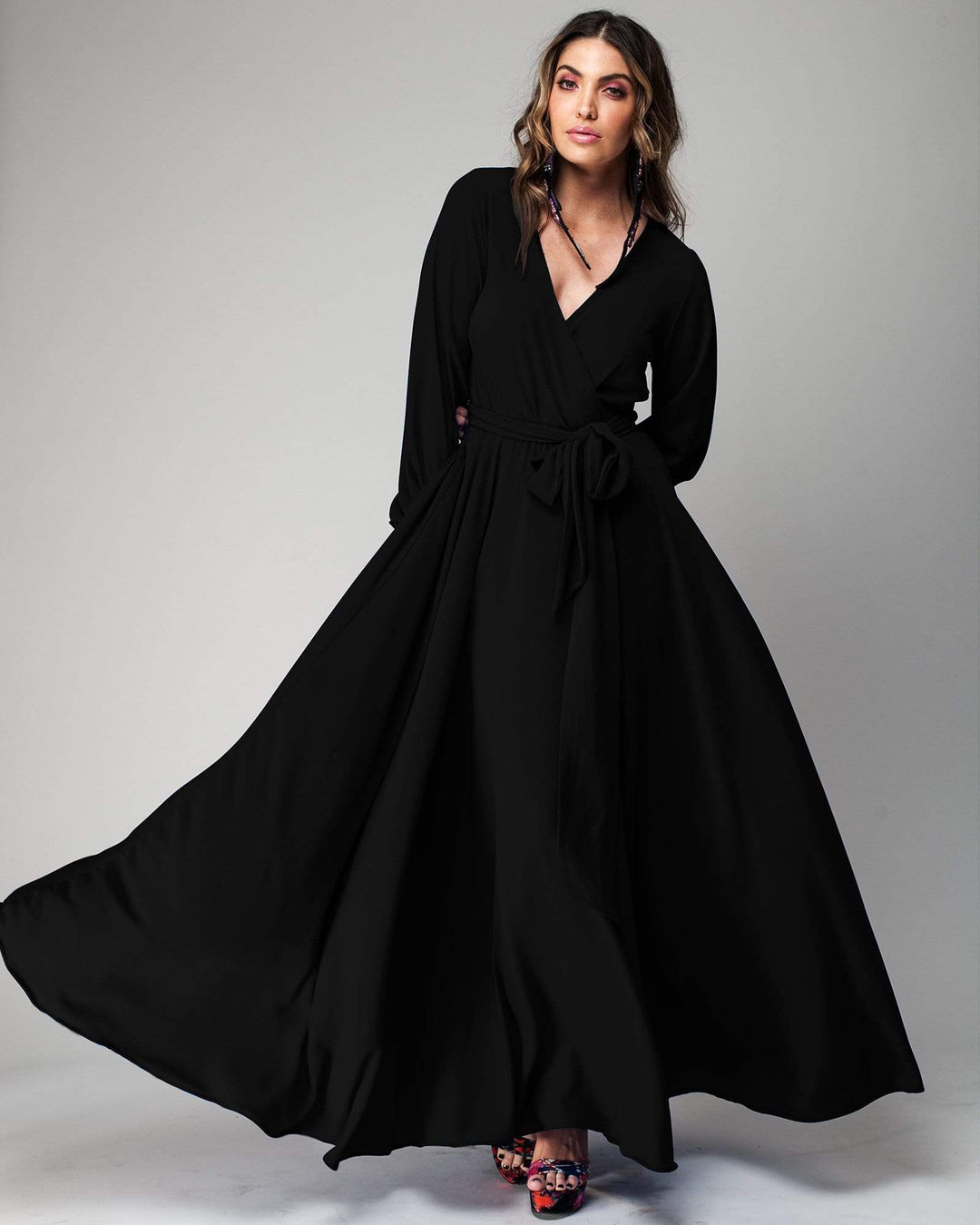 This 70's inspired maxi dress features a sexy cross front V-shaped surplice neckline.