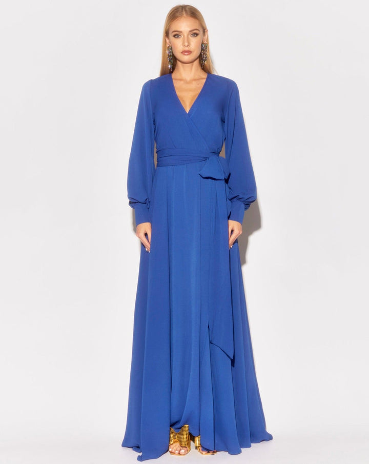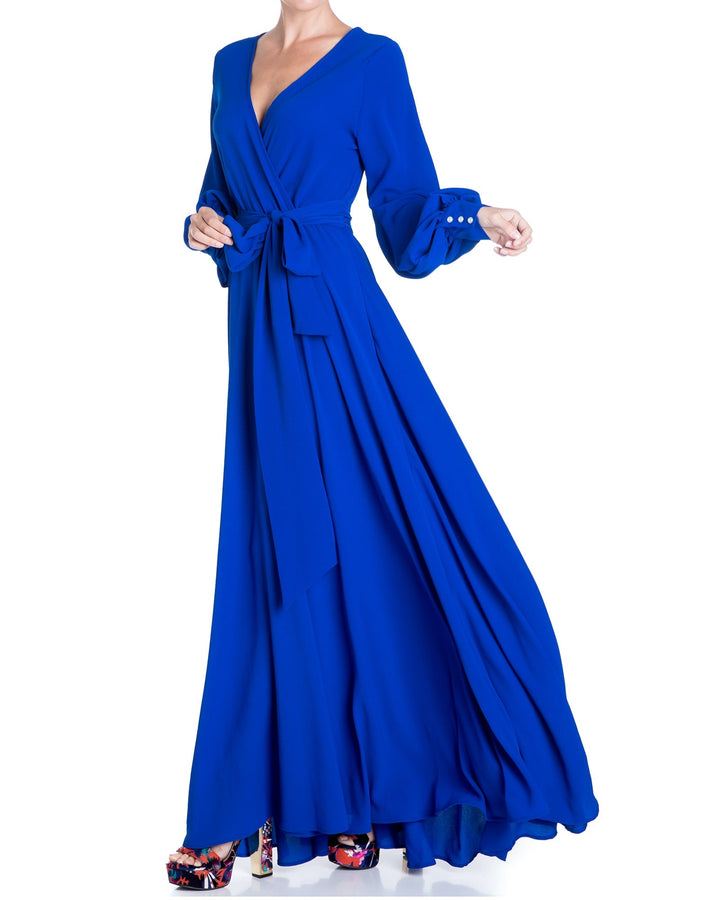 This 70's inspired maxi dress features a sexy cross front V-shaped surplice neckline.