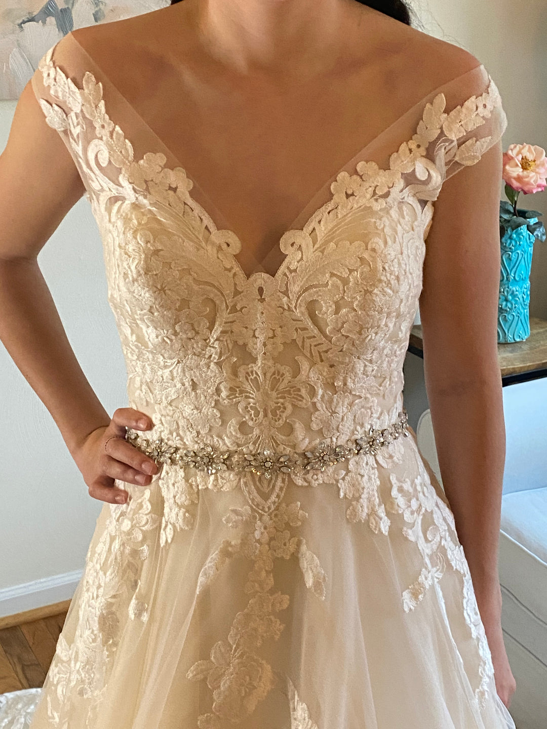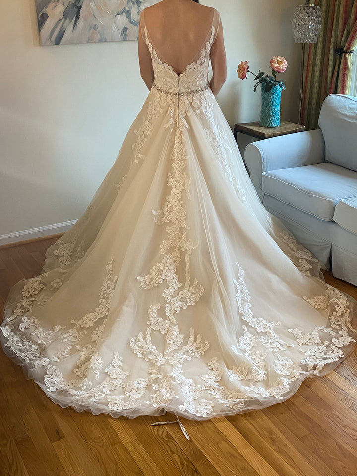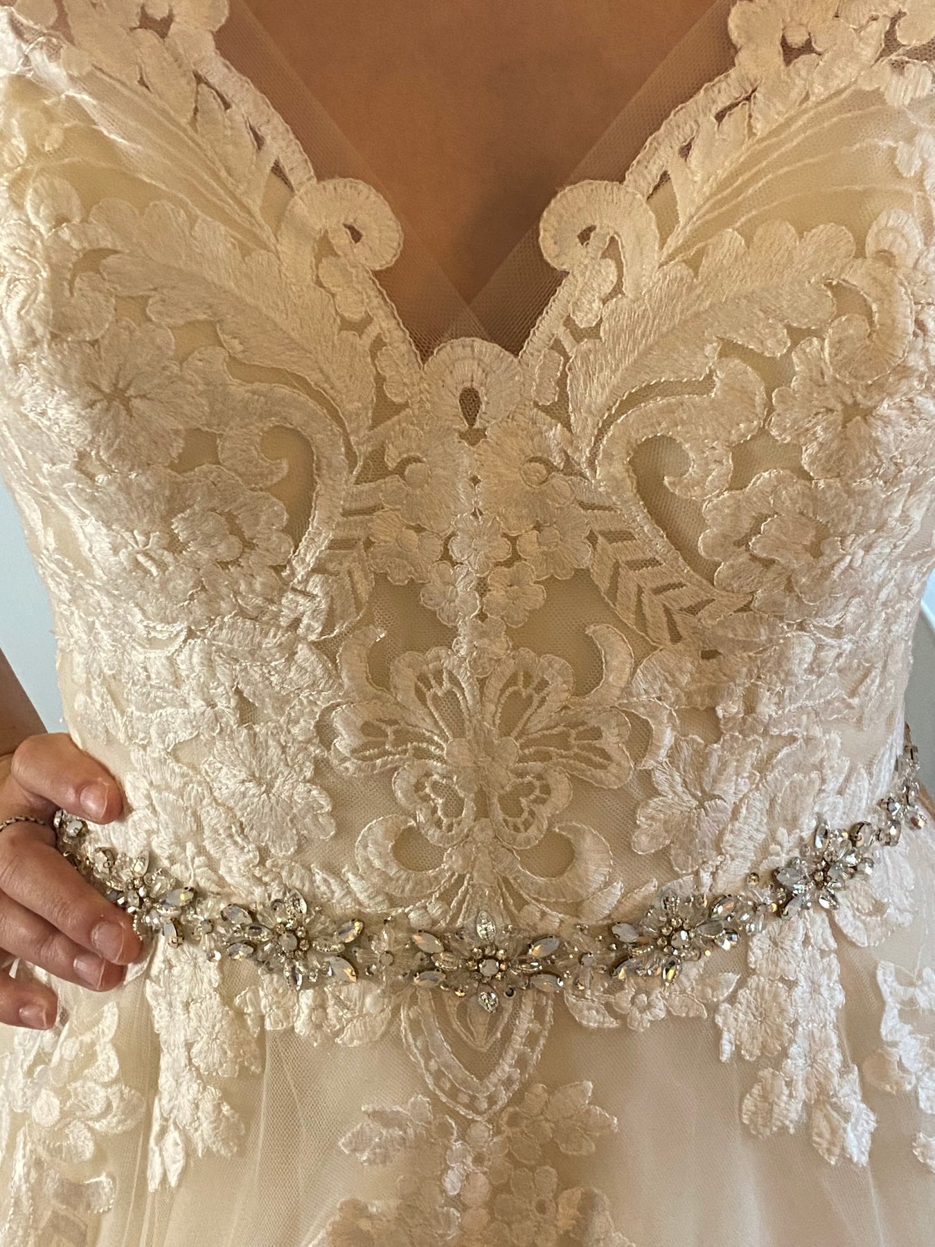Stunning V-Neck and back full A-Line gown with intricate lace accents and dainty crystal detailing along the waistline. *Gown was clipped to fit model.* Measurements for size 14 are 41"bust, 33" waist and 43.5" hips