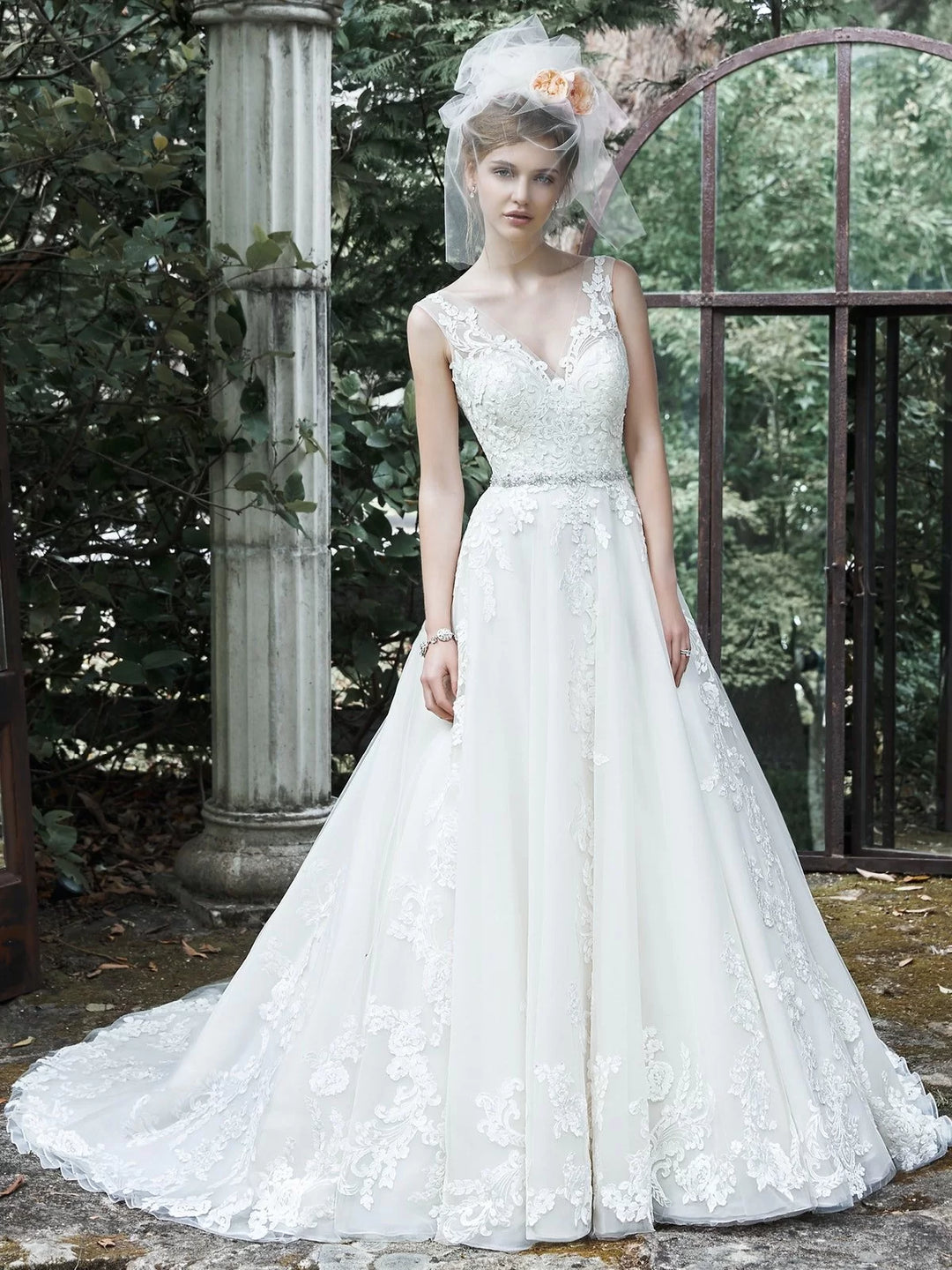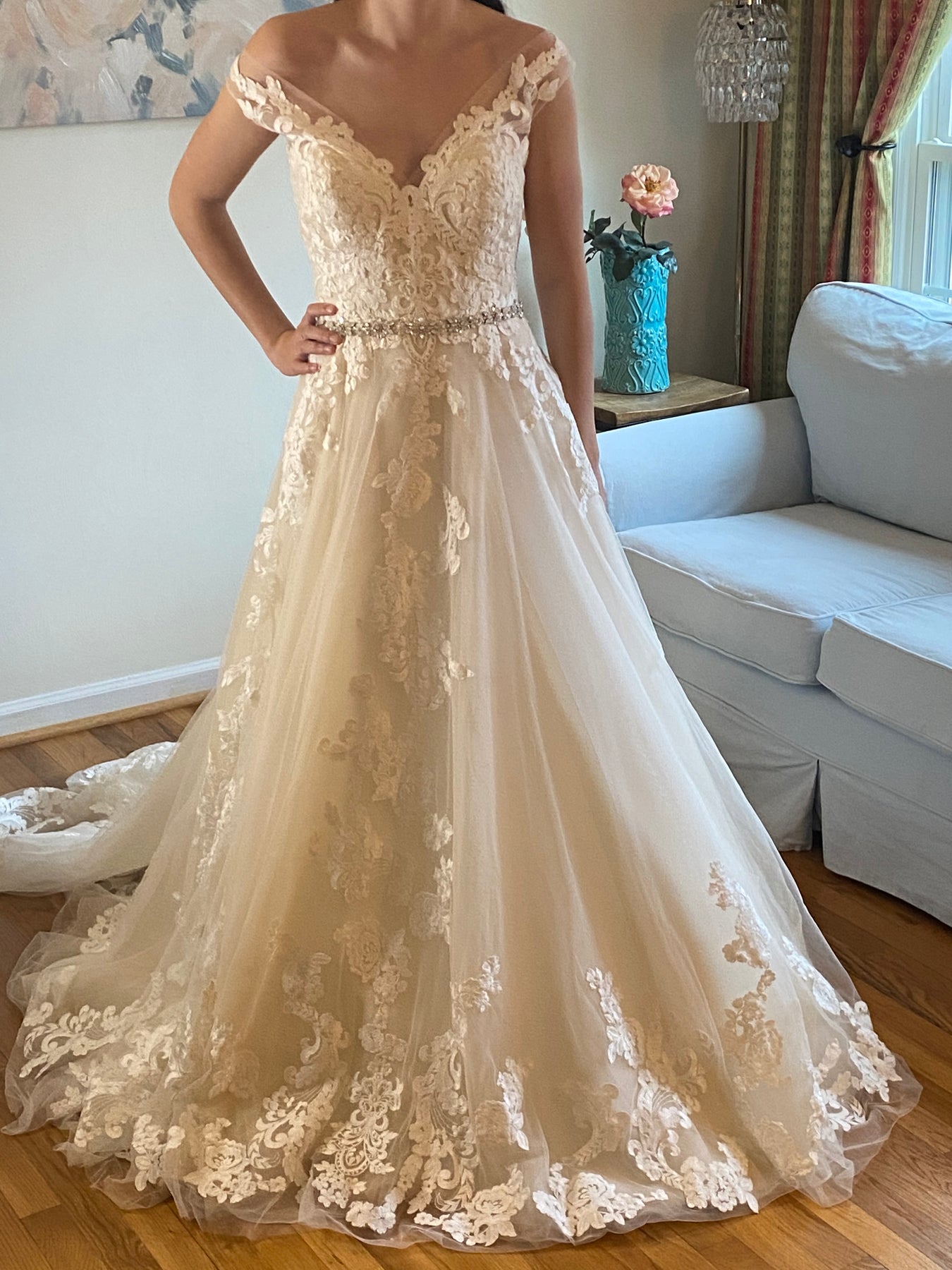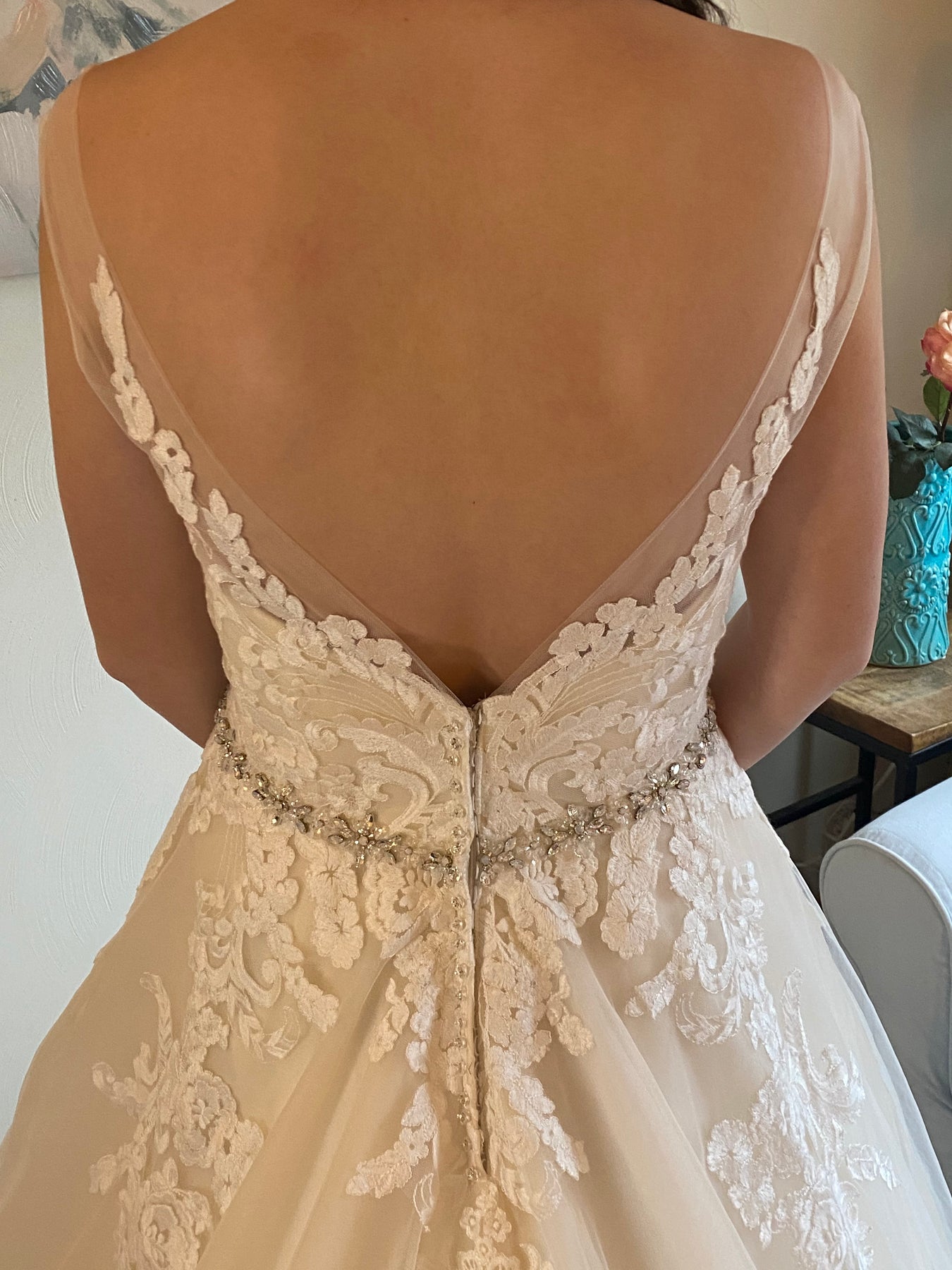 Stunning V-Neck and back full A-Line gown with intricate lace accents and dainty crystal detailing along the waistline. *Gown was clipped to fit model.* Measurements for size 14 are 41"bust, 33" waist and 43.5" hips