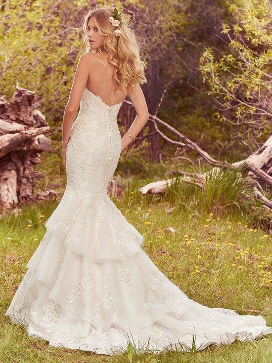 This glamorous fit-and-flare wedding gown features a layer of lace motifs atop crosshatched tulle, complete with a gorgeous layered train and strapless sweetheart neckline. Finished with crystal buttons over zipper and inner corset closure. Color is ivory/pewter.  This sample has a couple missing crystal buttons along the zipper, but could be easily replaced. Otherwise, this sample is in excellent condition.
